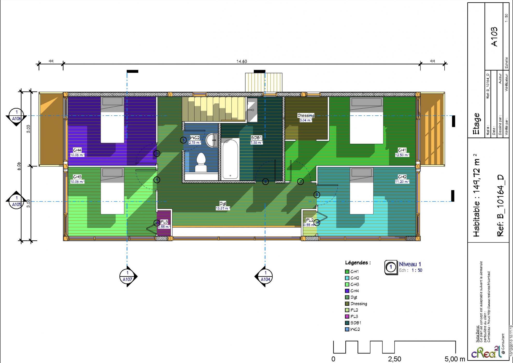 Plan B_10164_D : Maison en bois R + 1, 4 chambres ayant 150 m² habitables.