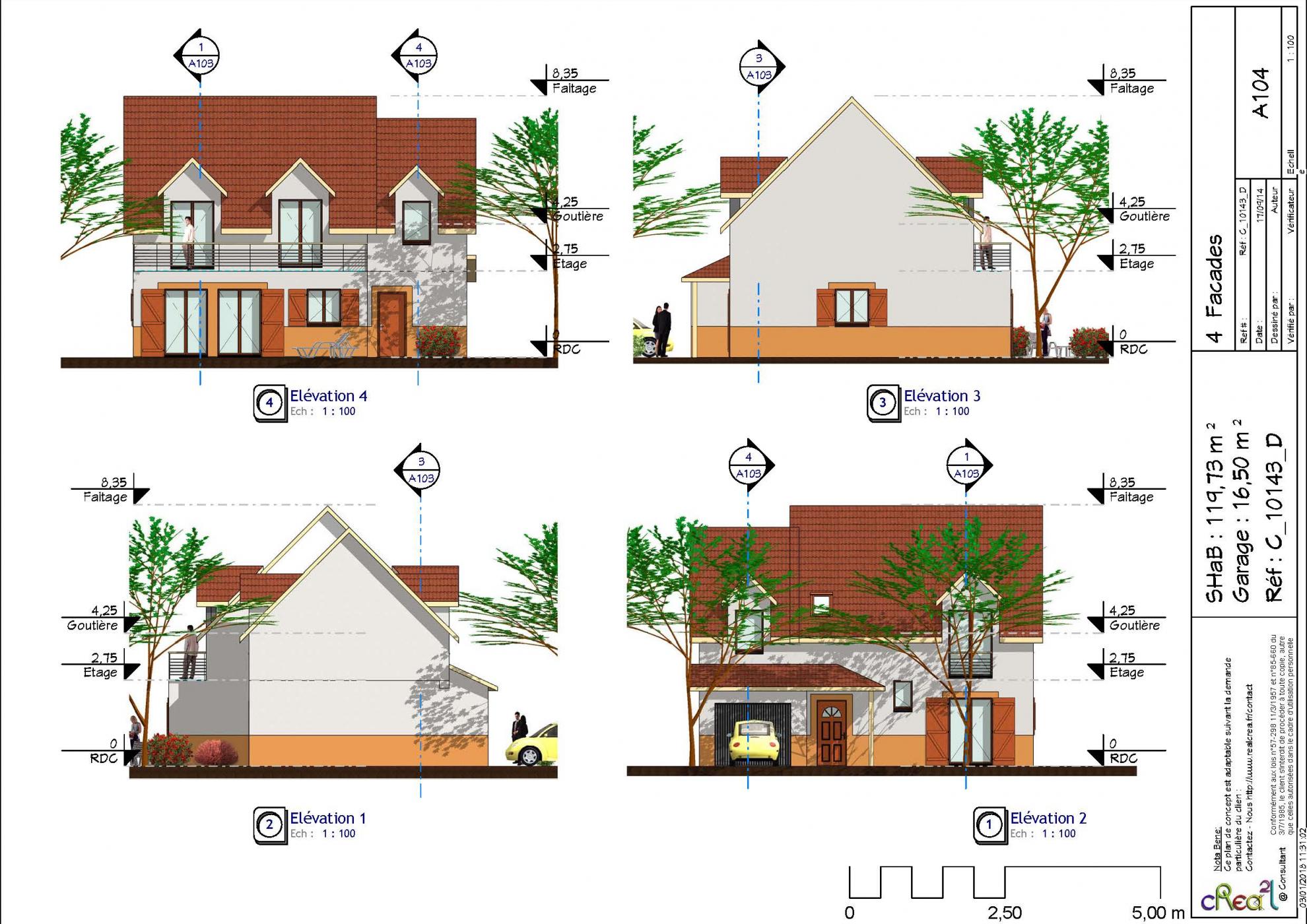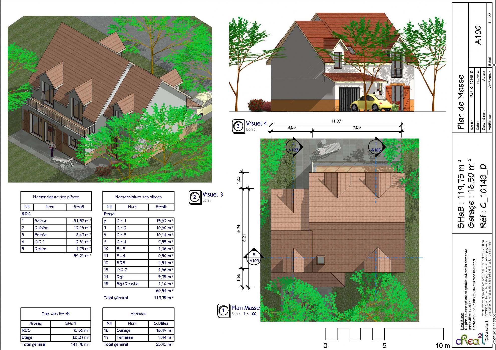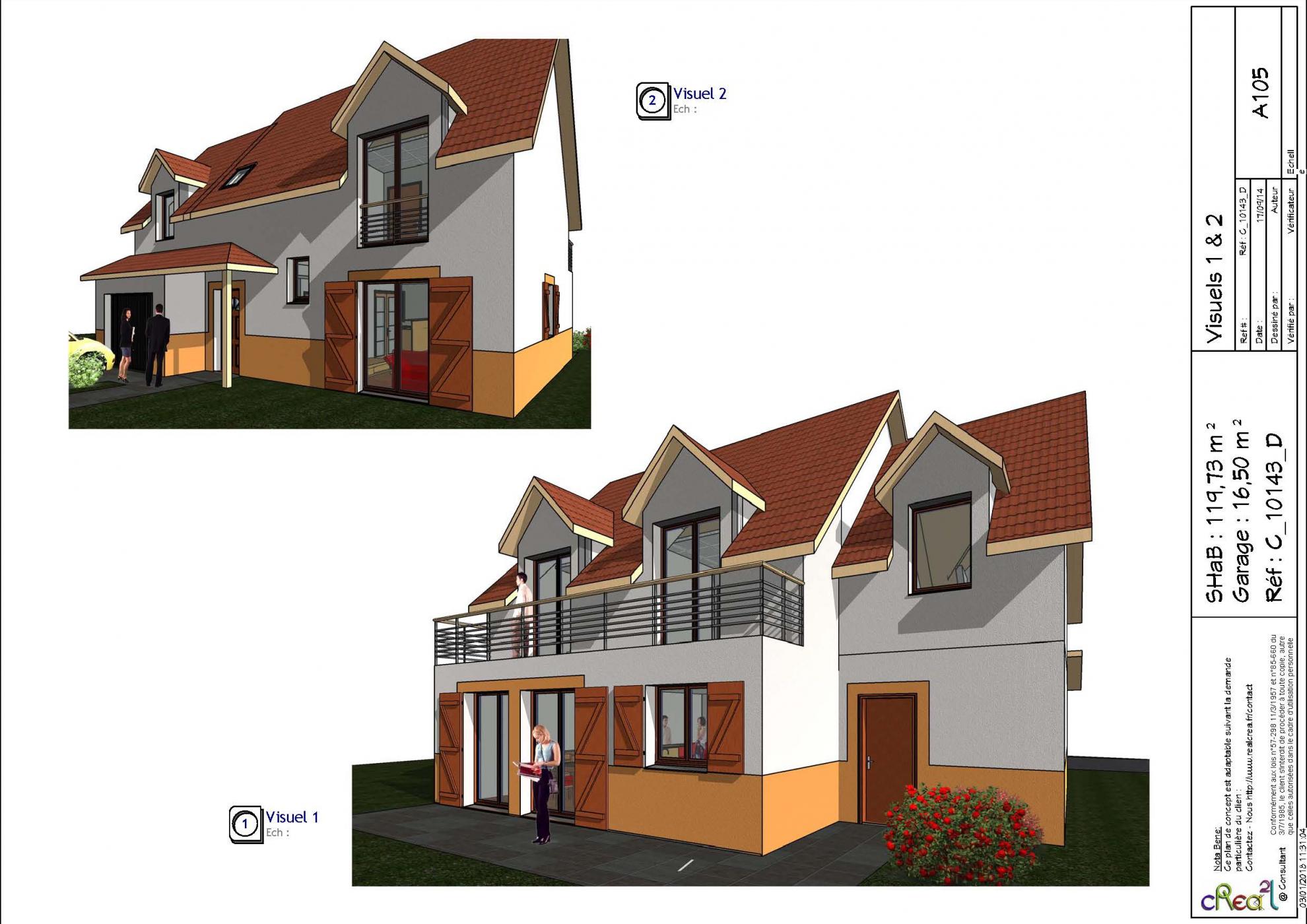 Plan C_10143_D : Maison R + Combles, 4 chambres ayant 120 m² habitables + garage intégré.