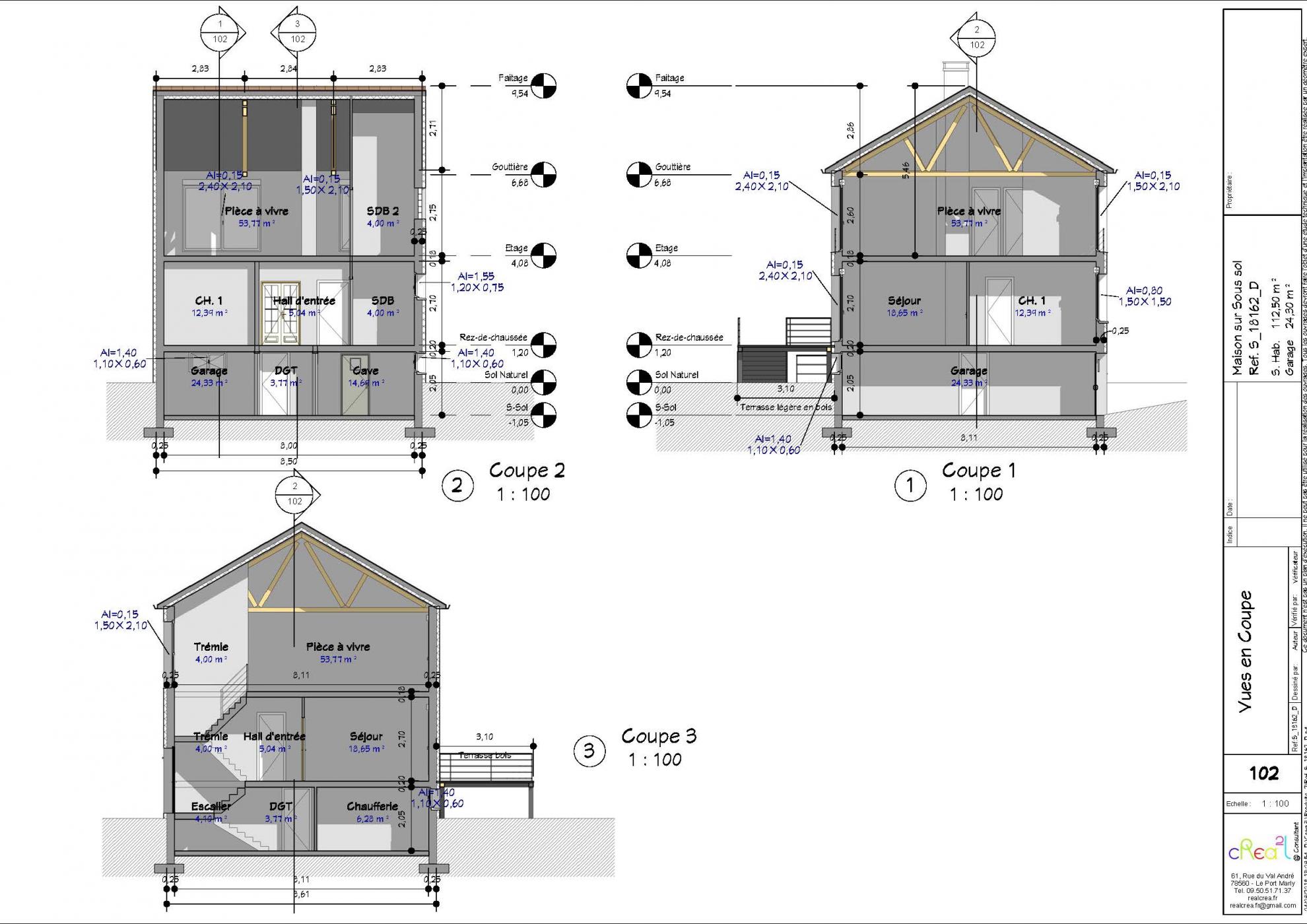 Plan S_18162_D : Maison contemporaine sur sous sol complet, R+1+S, 162 M², Taille T4 dont 1 Suite parentale en loft à étage, Grand garage en sous sol demie-enterré.