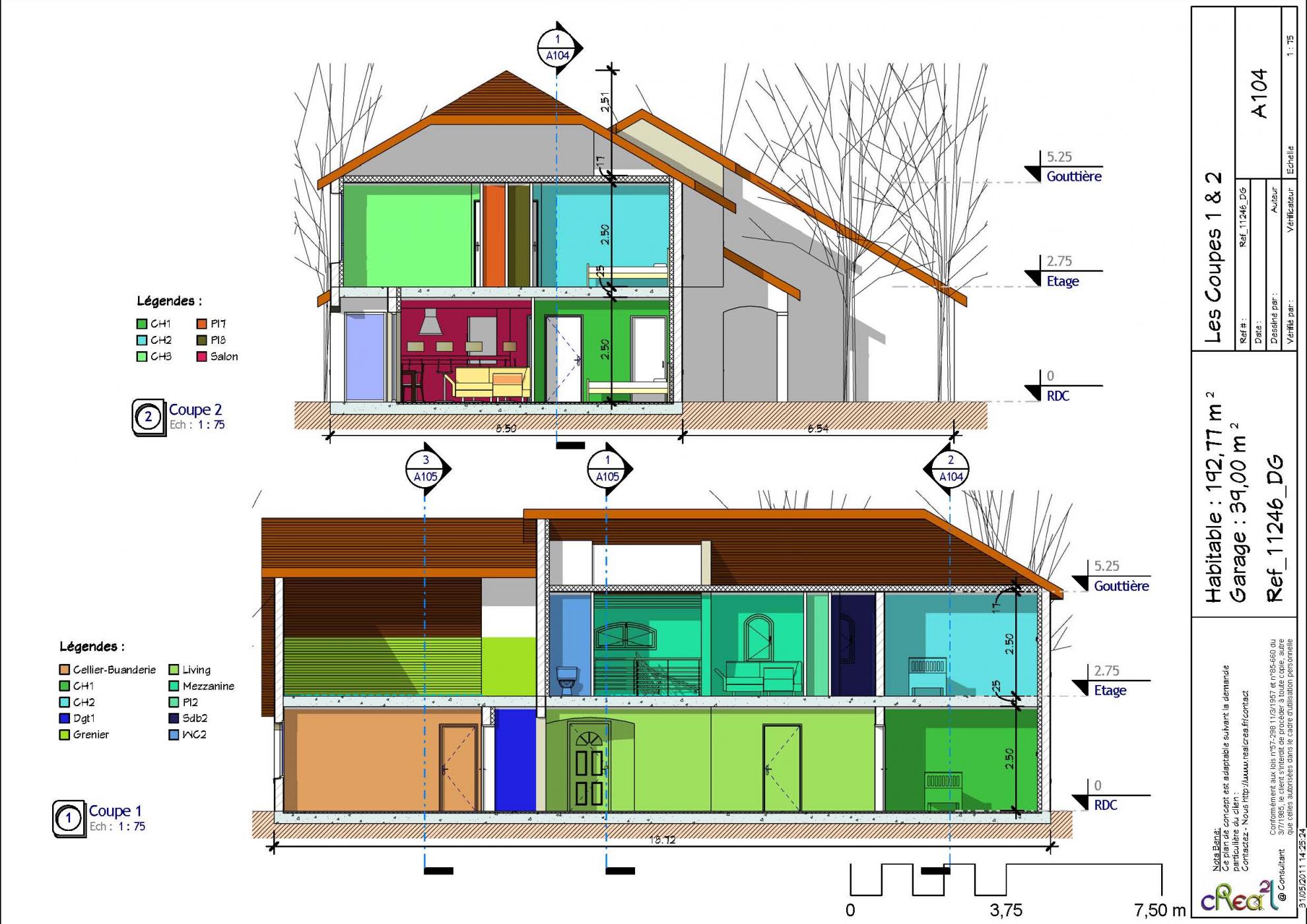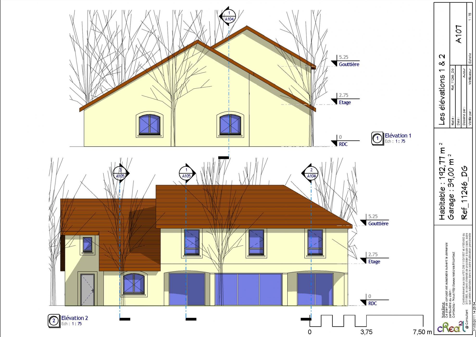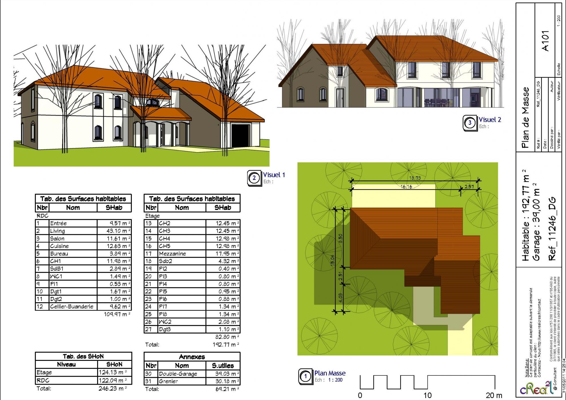 Plan 11246_DG : Maison contemporaine, R+1, 6 chambres, 192 m² habitables, double garages.