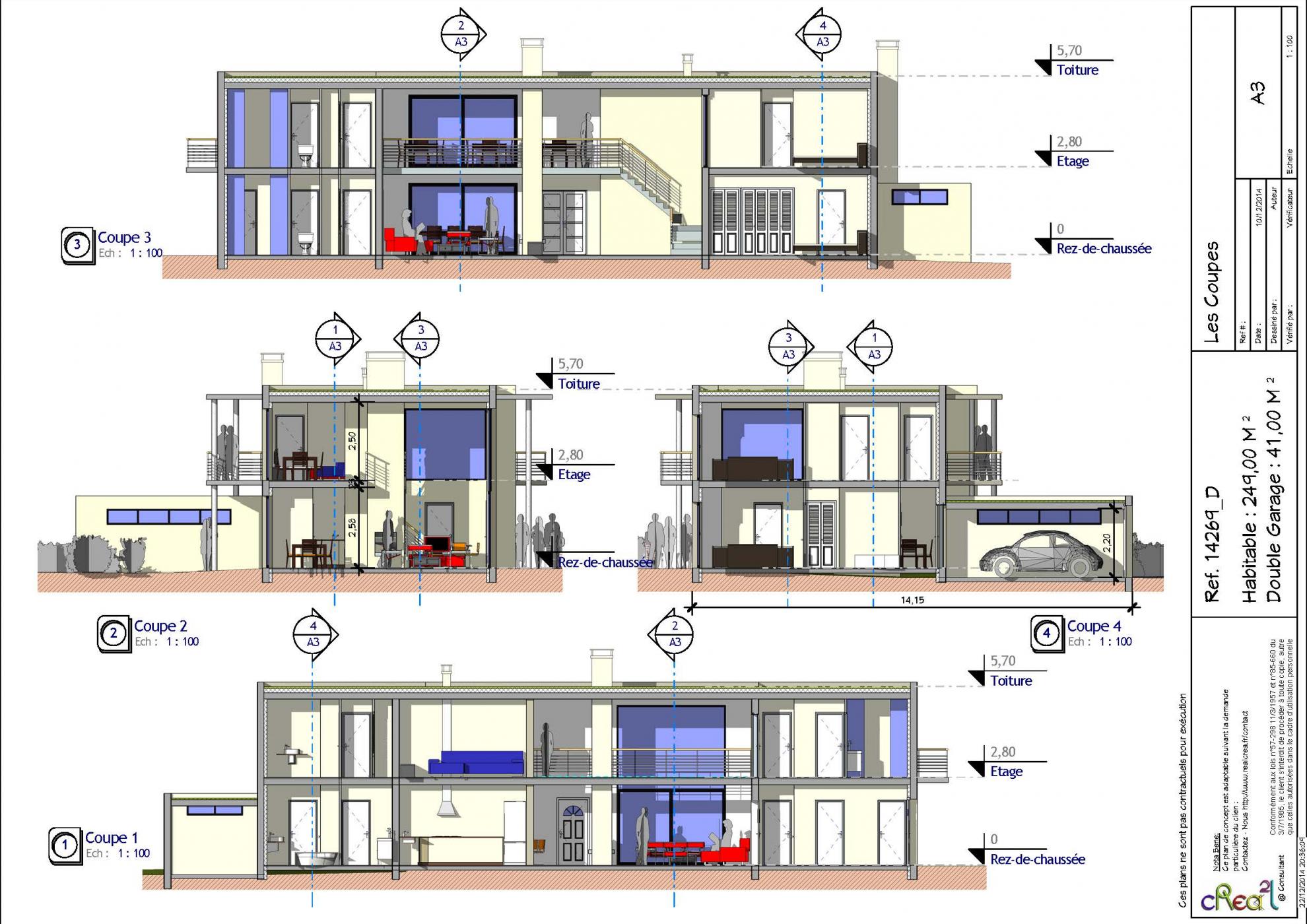Plan 14269_D : Maison moderne R+1, T7, 240 M², Grand Garage intégré.