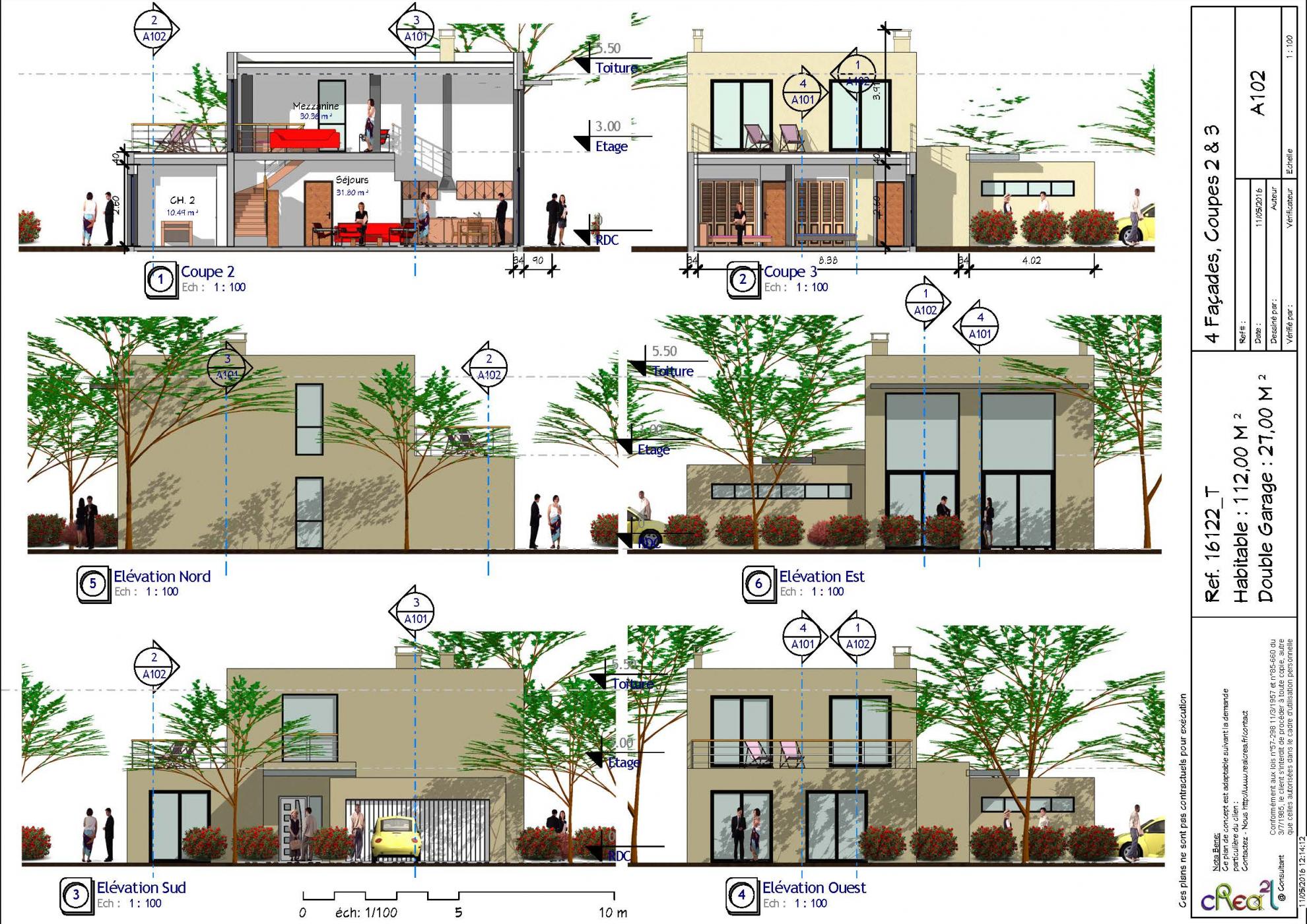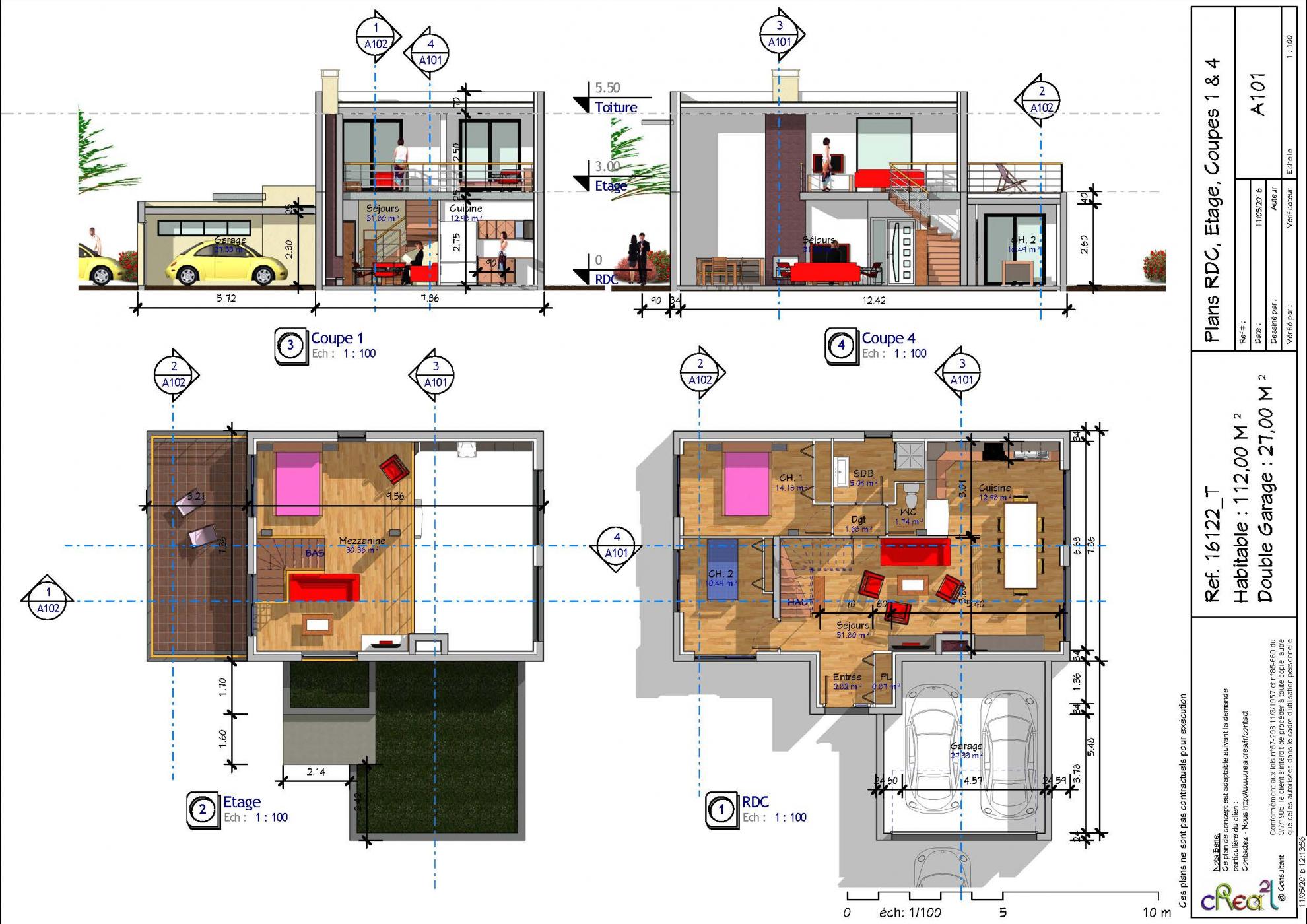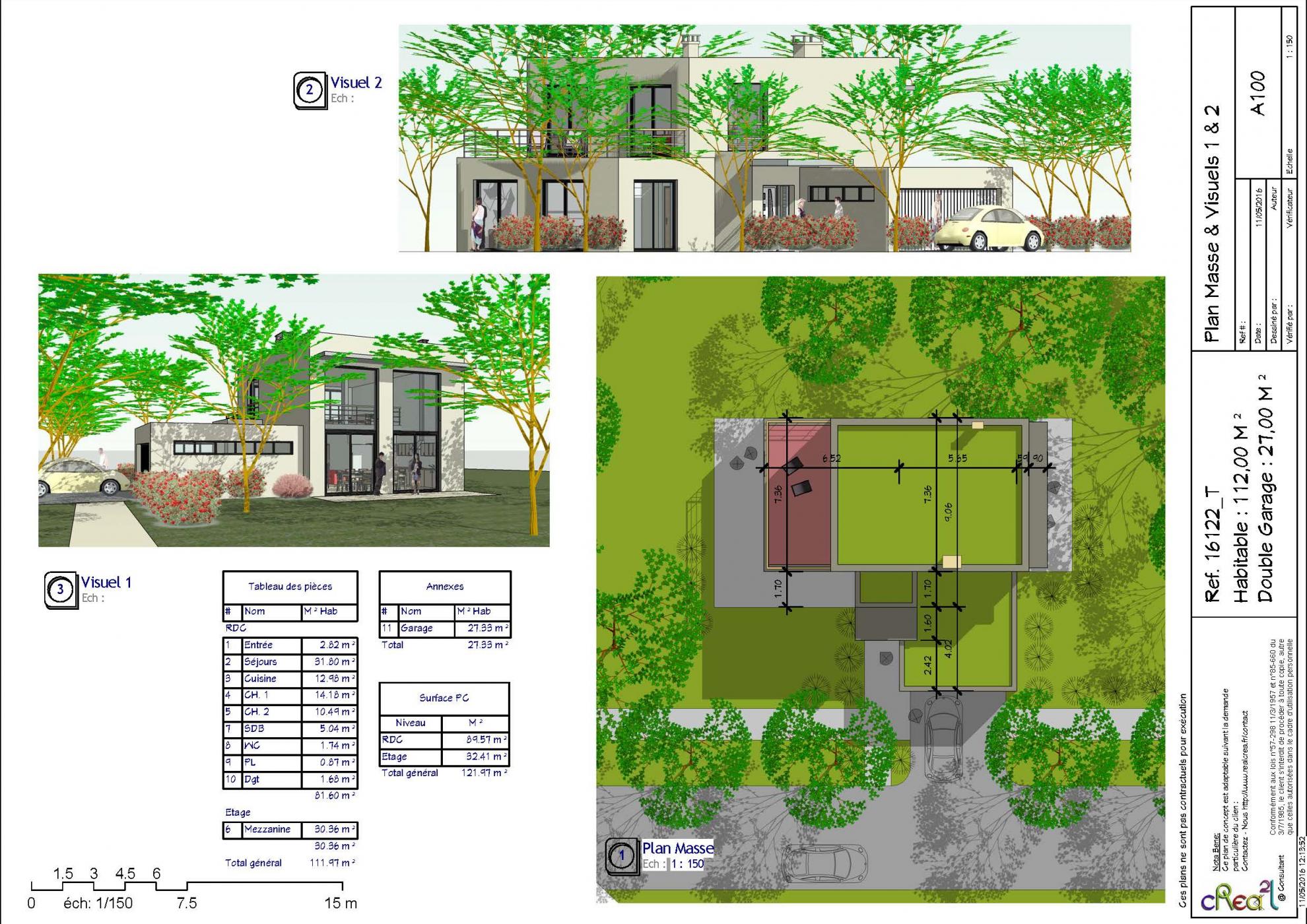 Plan 16122_T : Maison avec Mezzanine, 112 M² habitable, 3 Chambres et garage 2 voitures intégré.