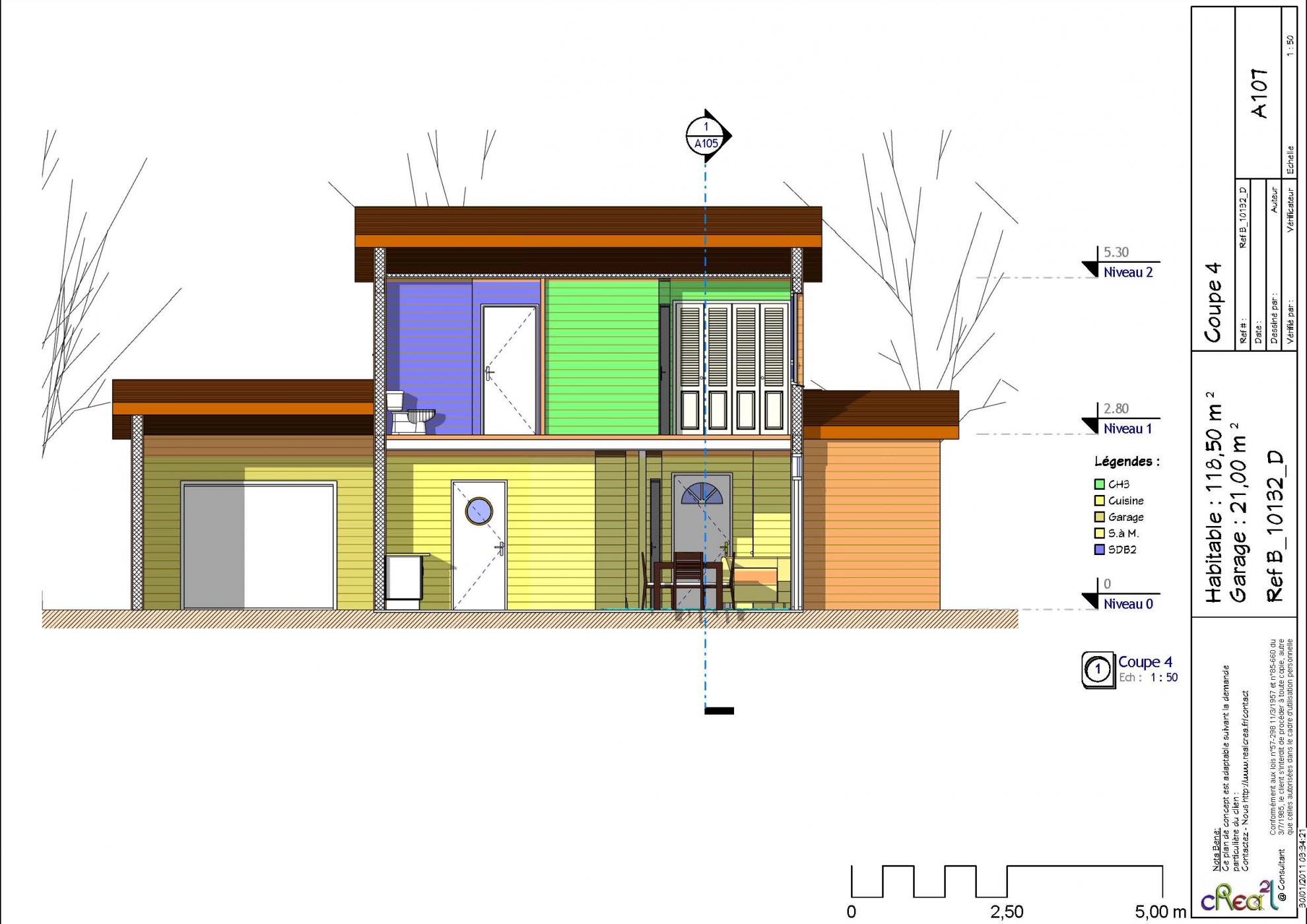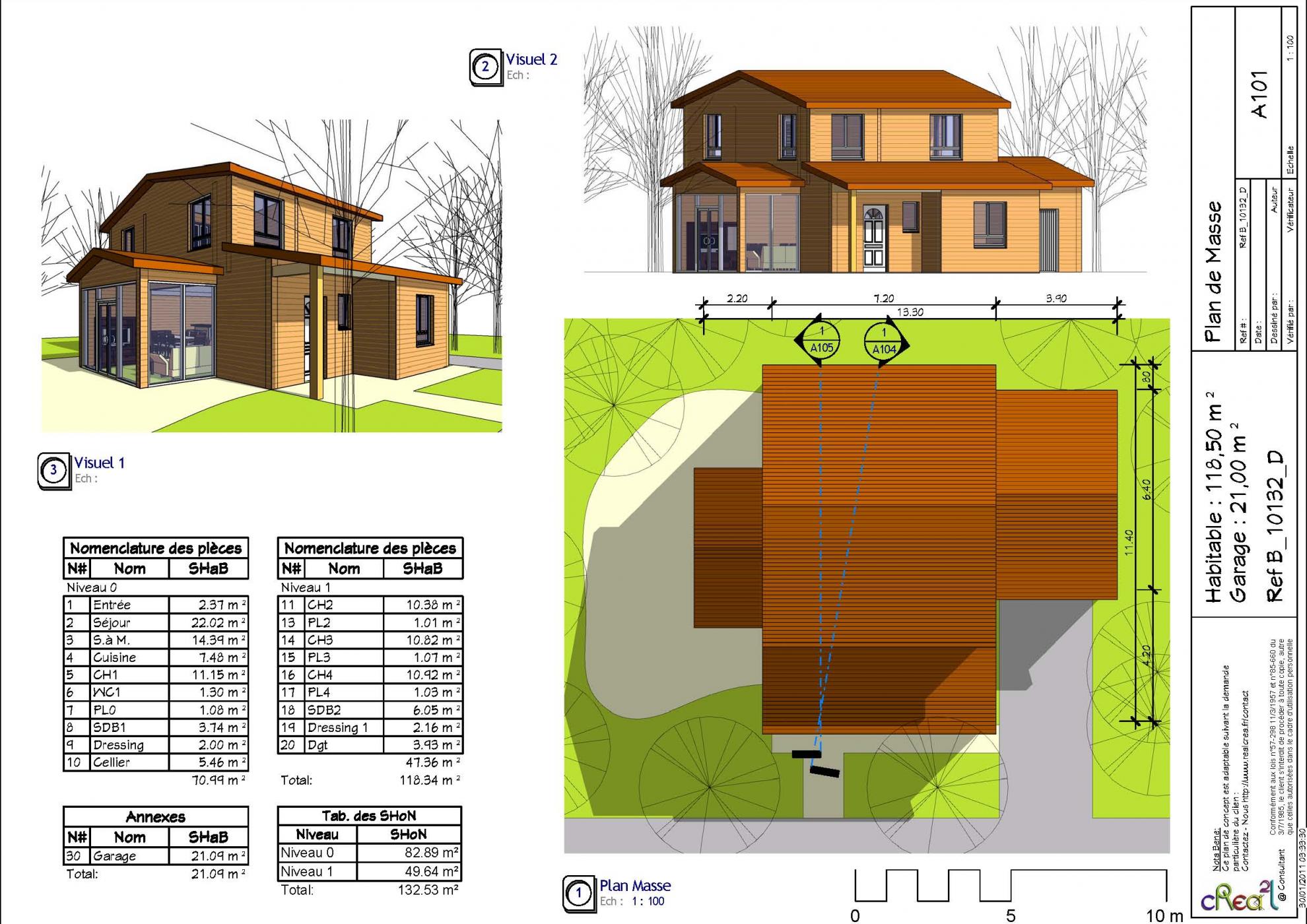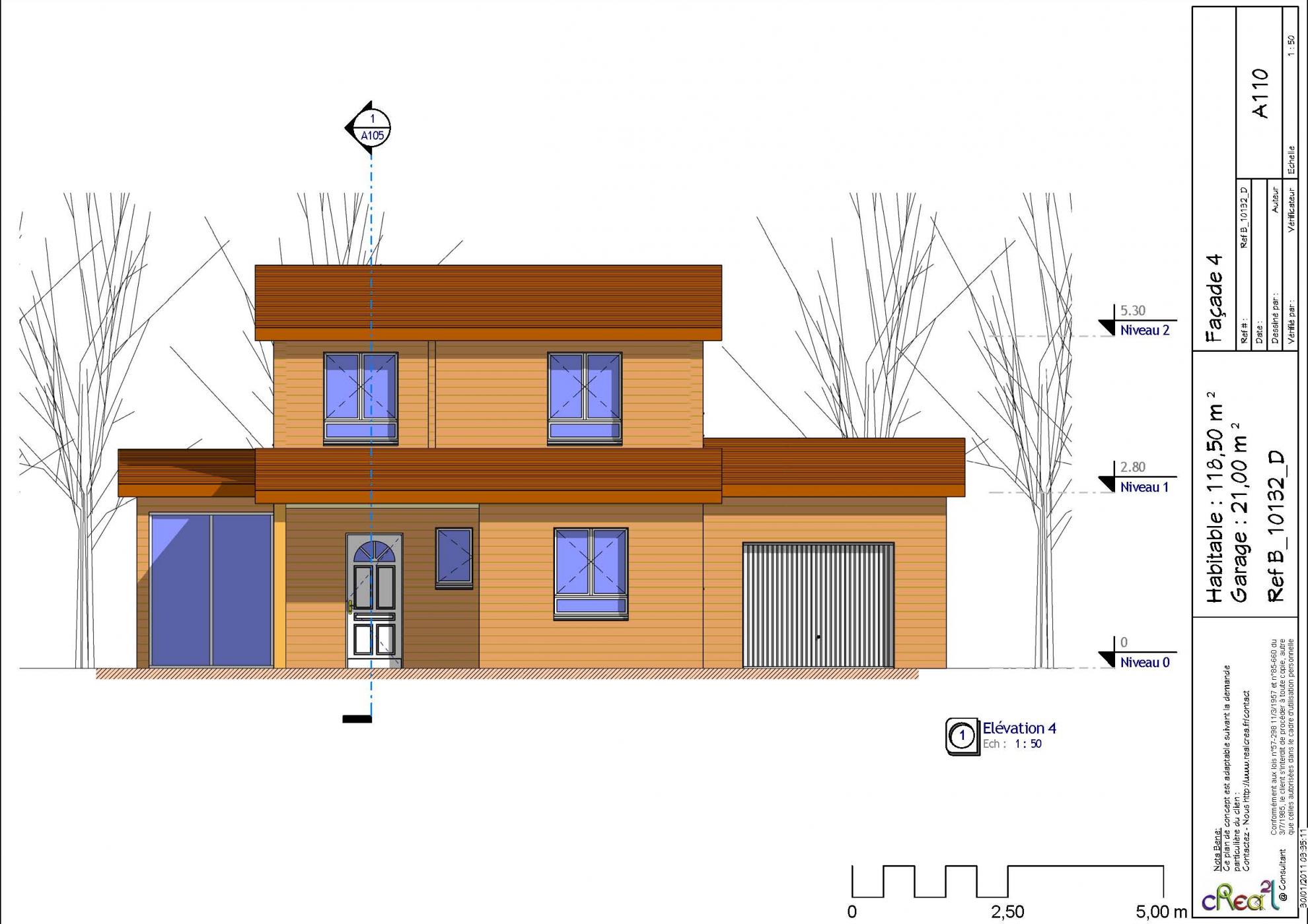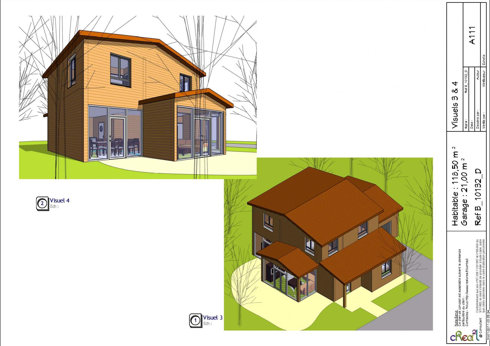 Plan B_10132_D : Maison en bois 4 chambres 118 m² habitables + Garage intégré.