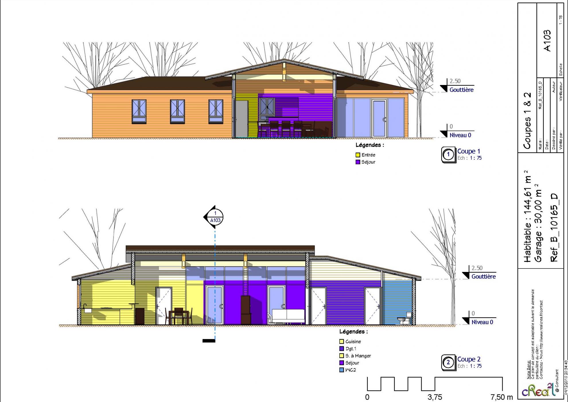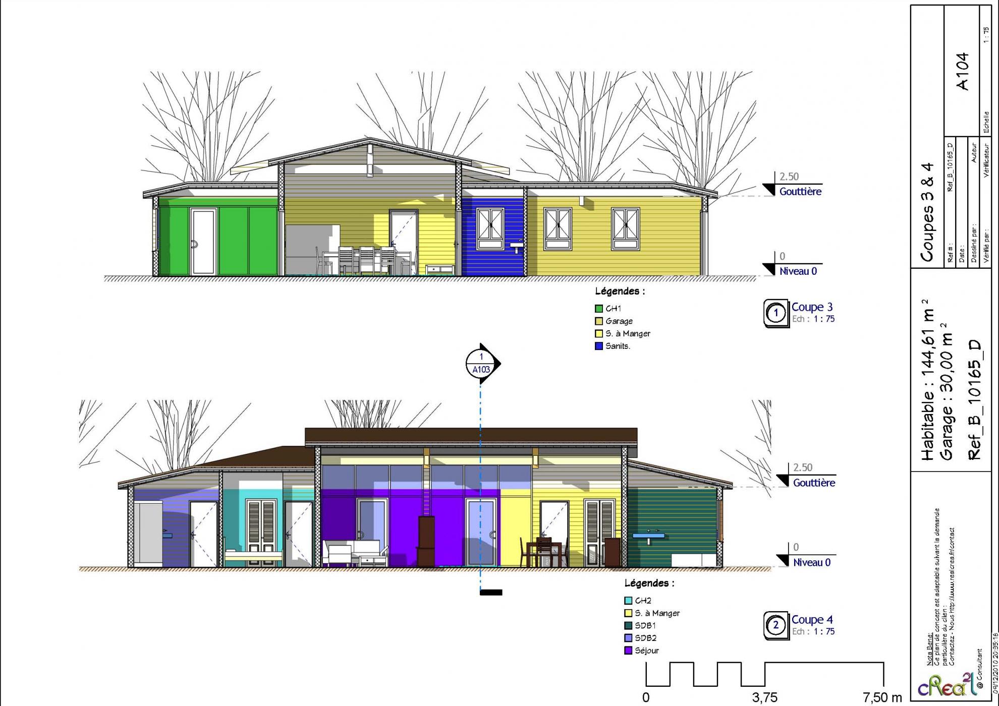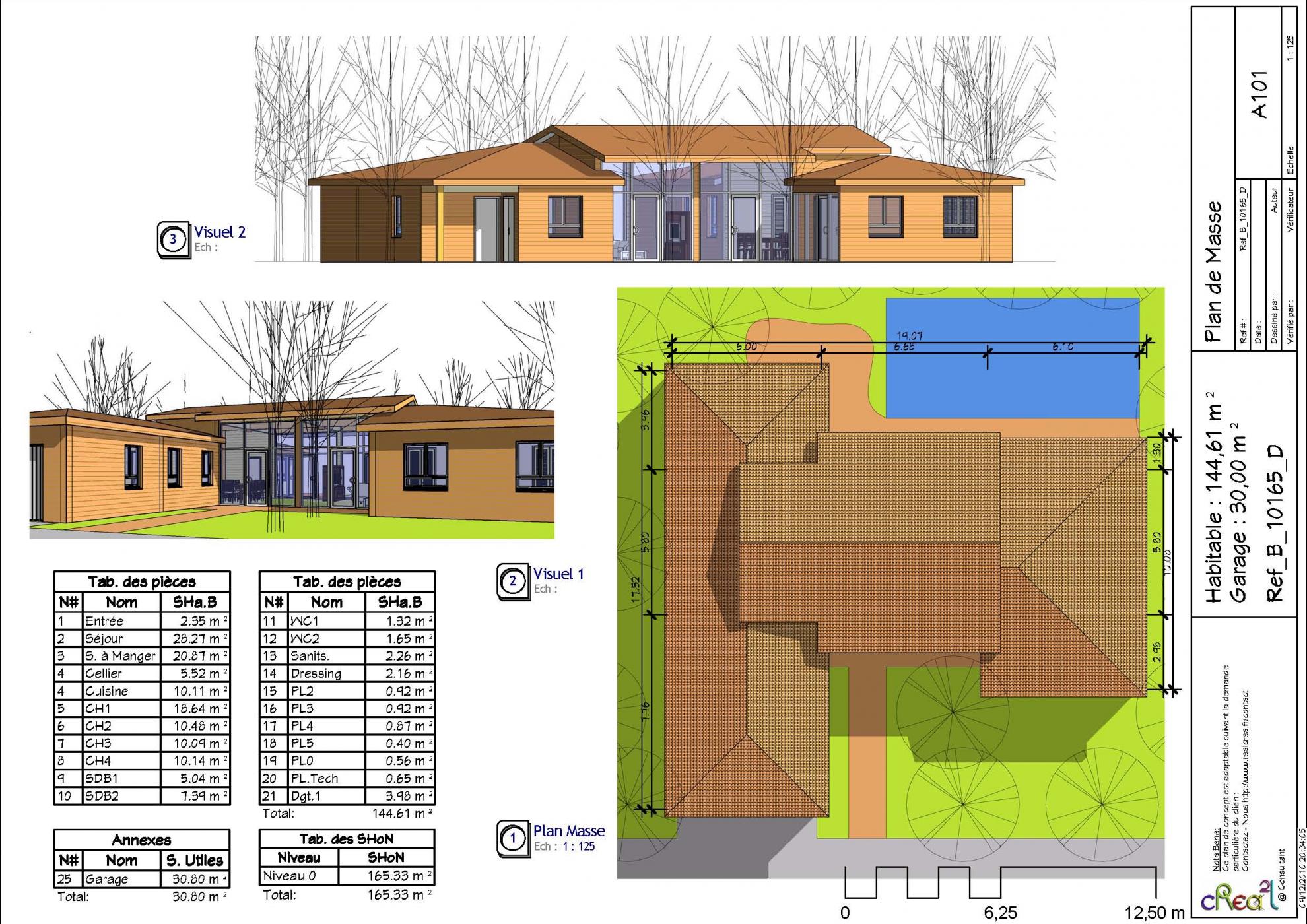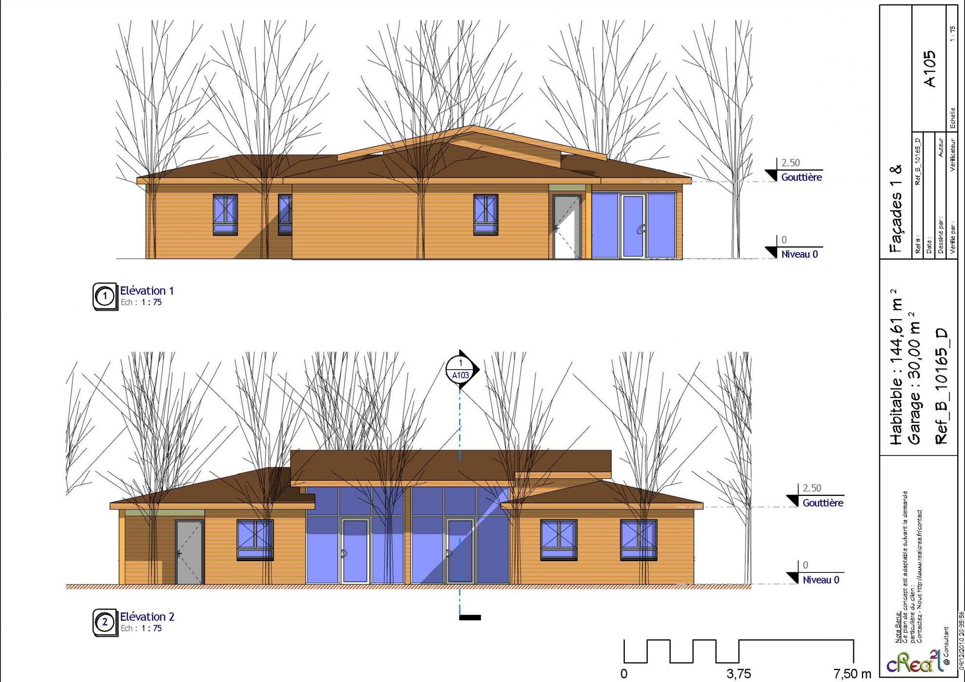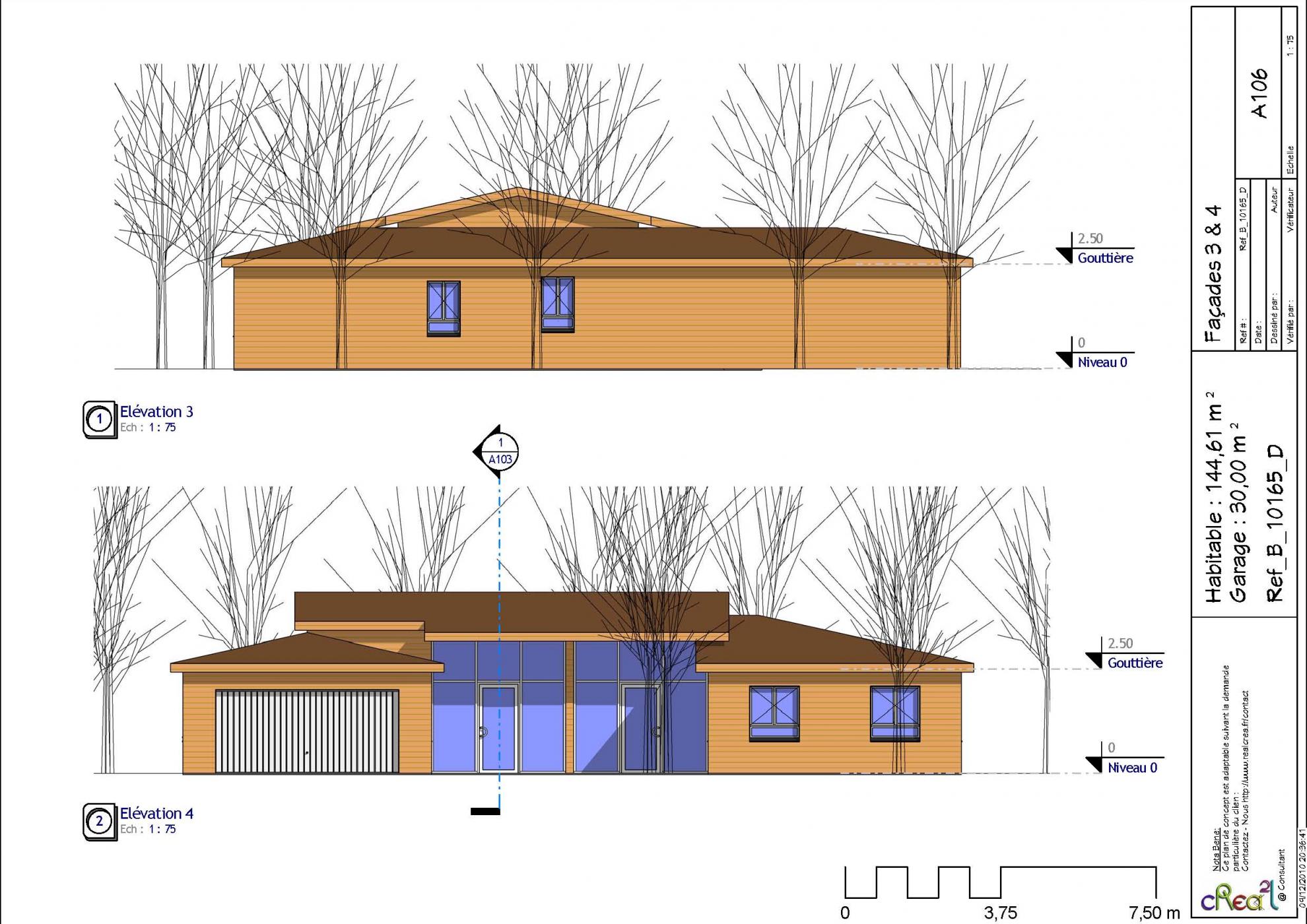 Plan B_10165_D : Maison en bois, 4 chambres, 144 m² habitables, plain-pied + grand garage intégré.