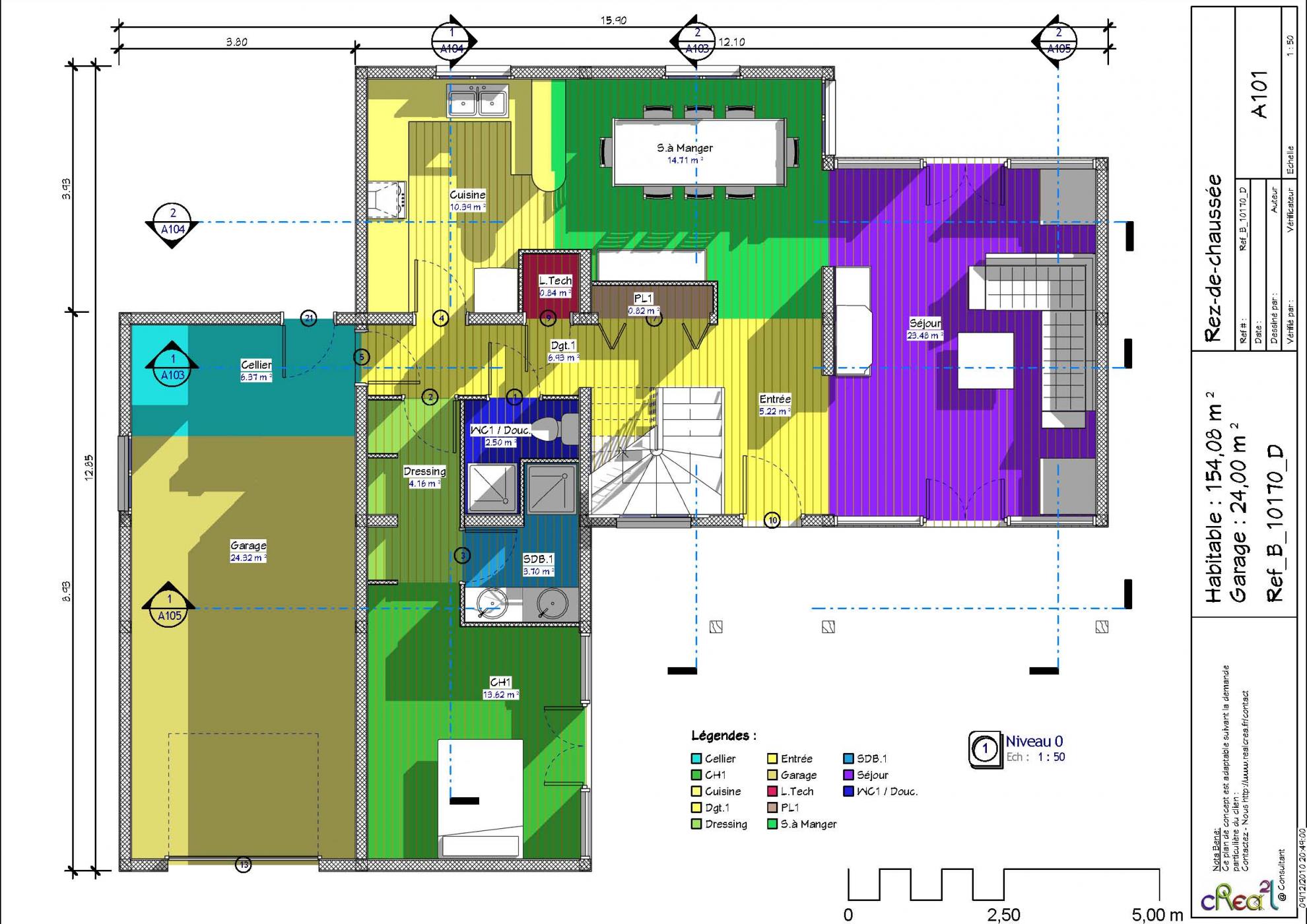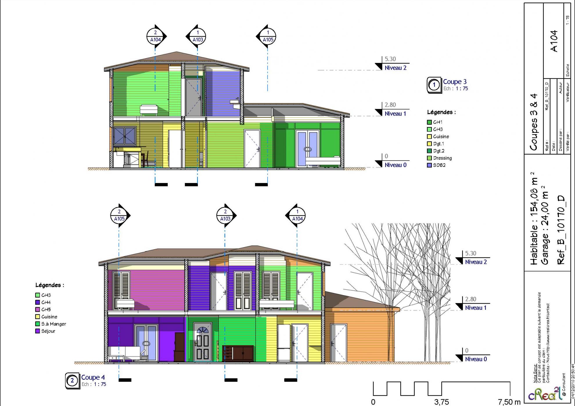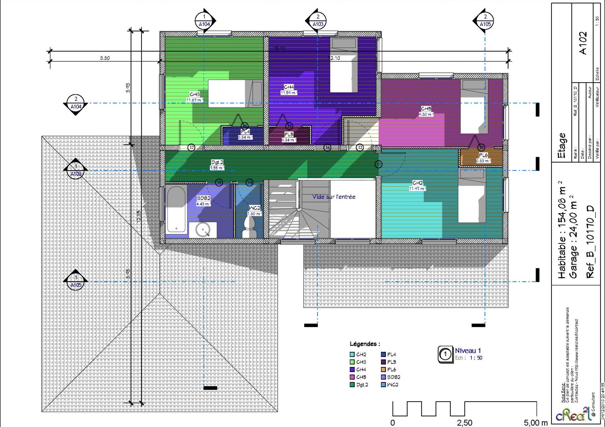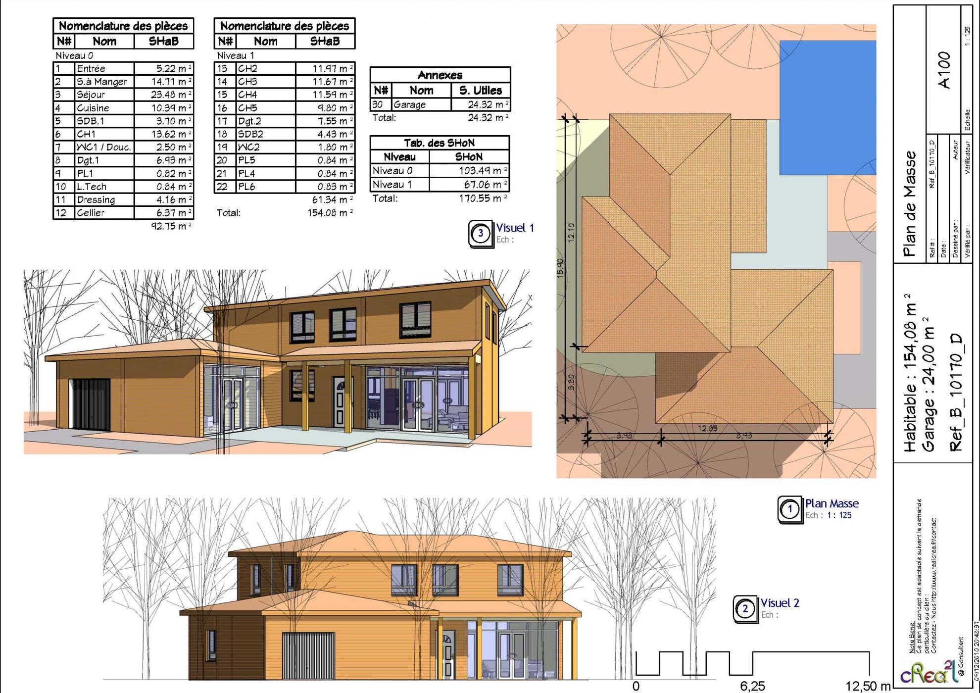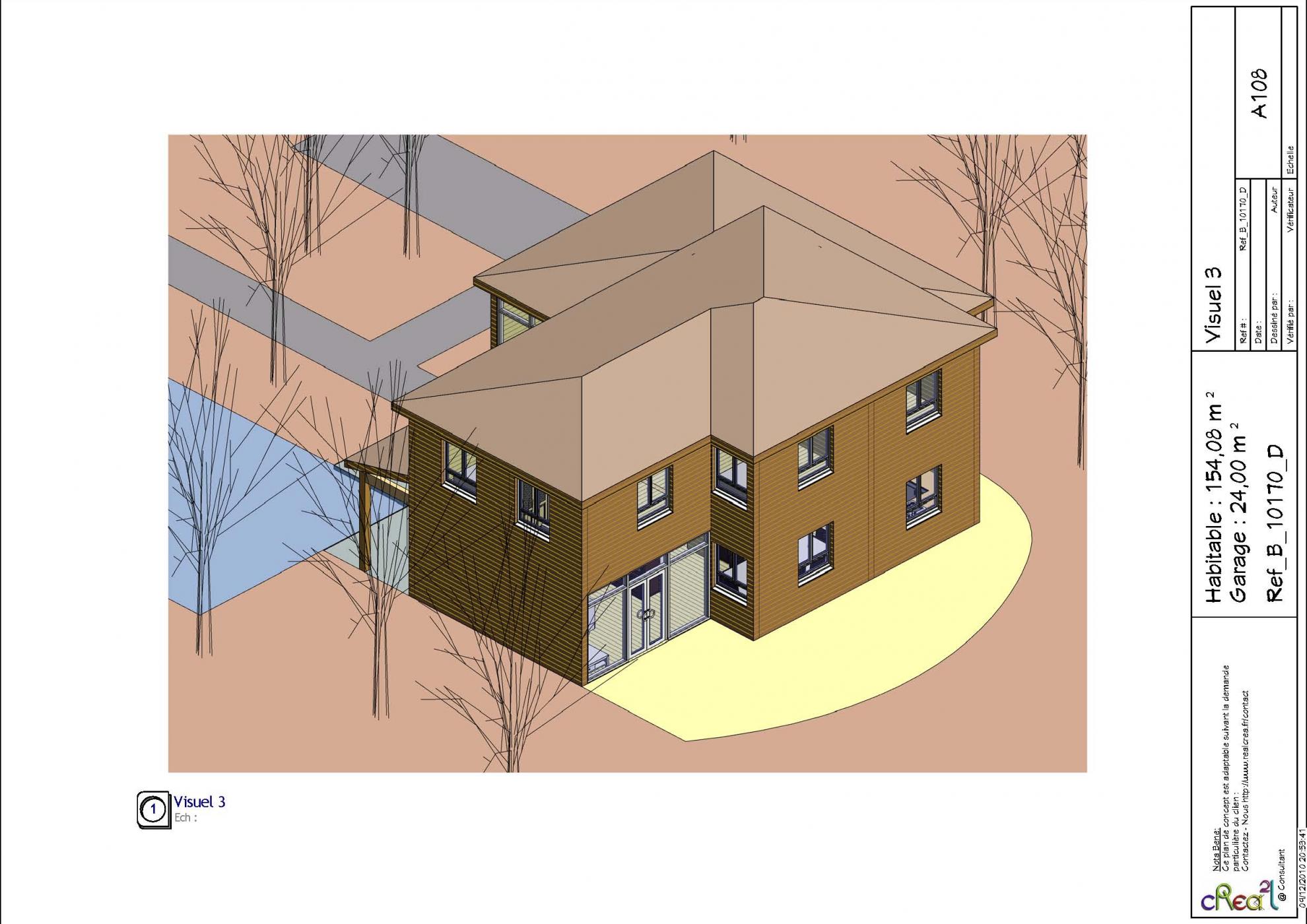 Plan B_10170_D : Maison en bois, 5 chambres, 154 m² habitables + Garage intégré.