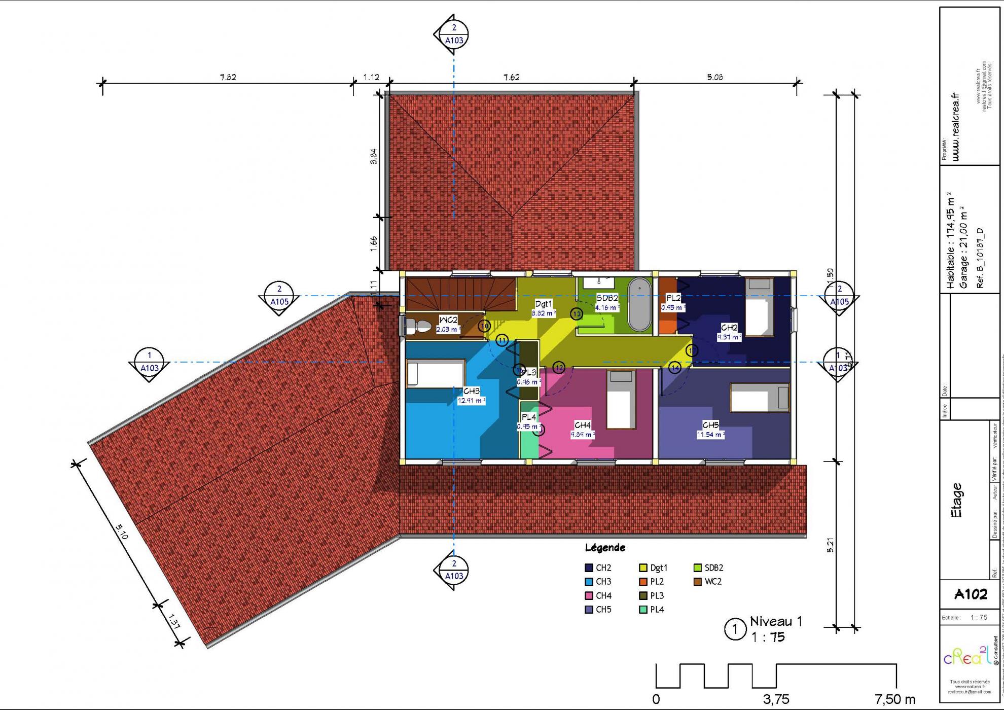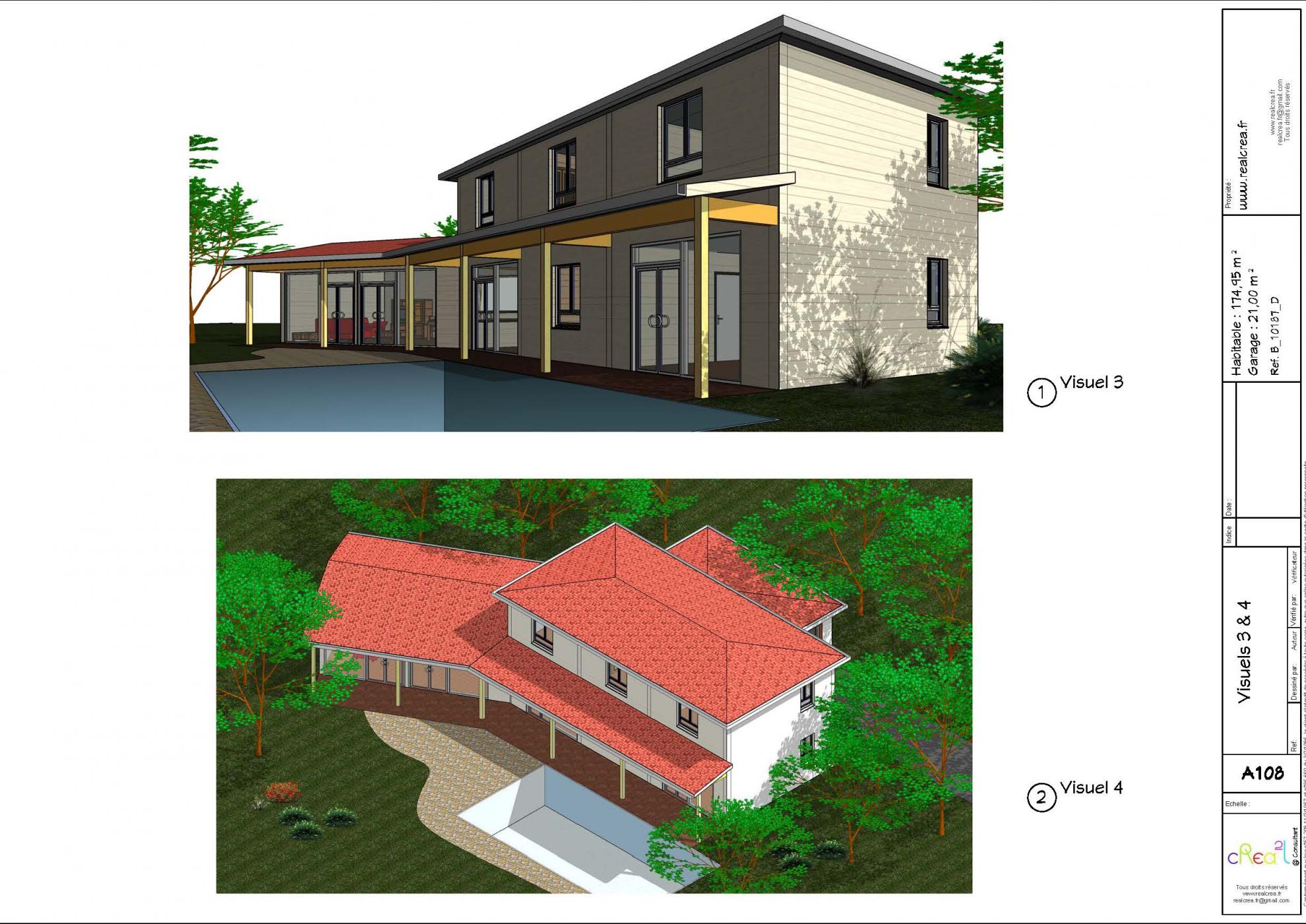 Plan B_10187_D : Maison en construction bois, r+1, 175 m² habitable avec le grand séjour traversant avec terrasse et la piscine, 1 suite à rdc et 4 chambres à étage ... garage 2 voiture.