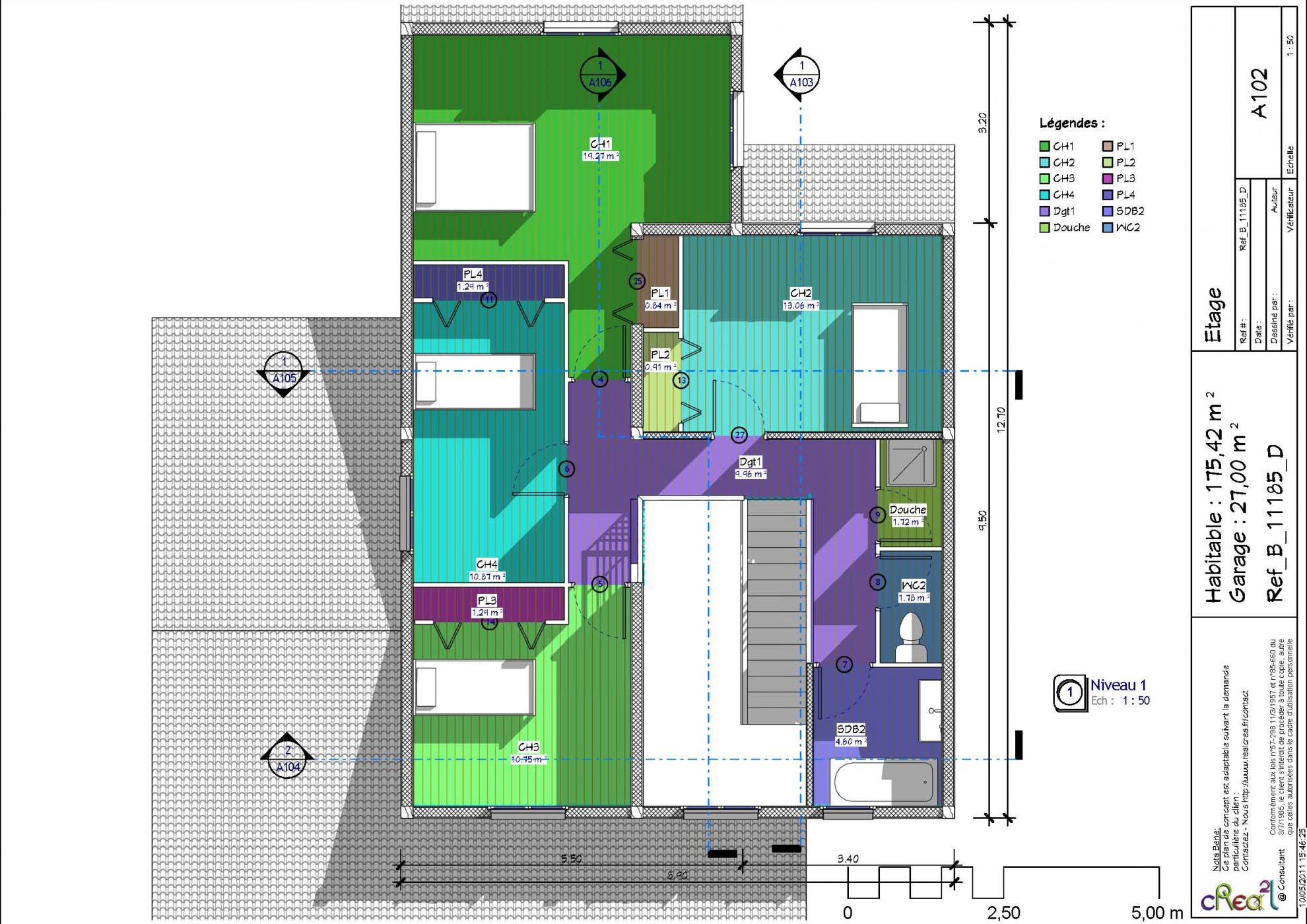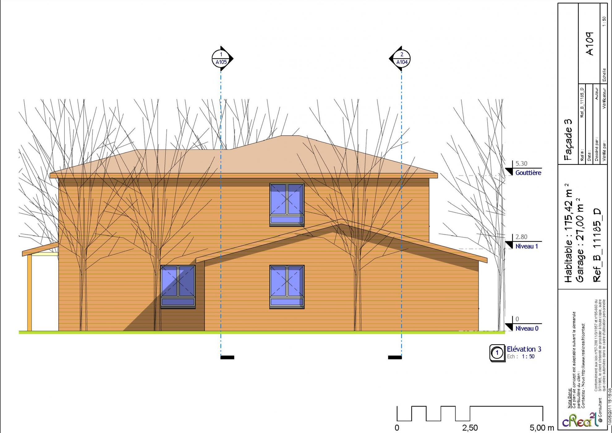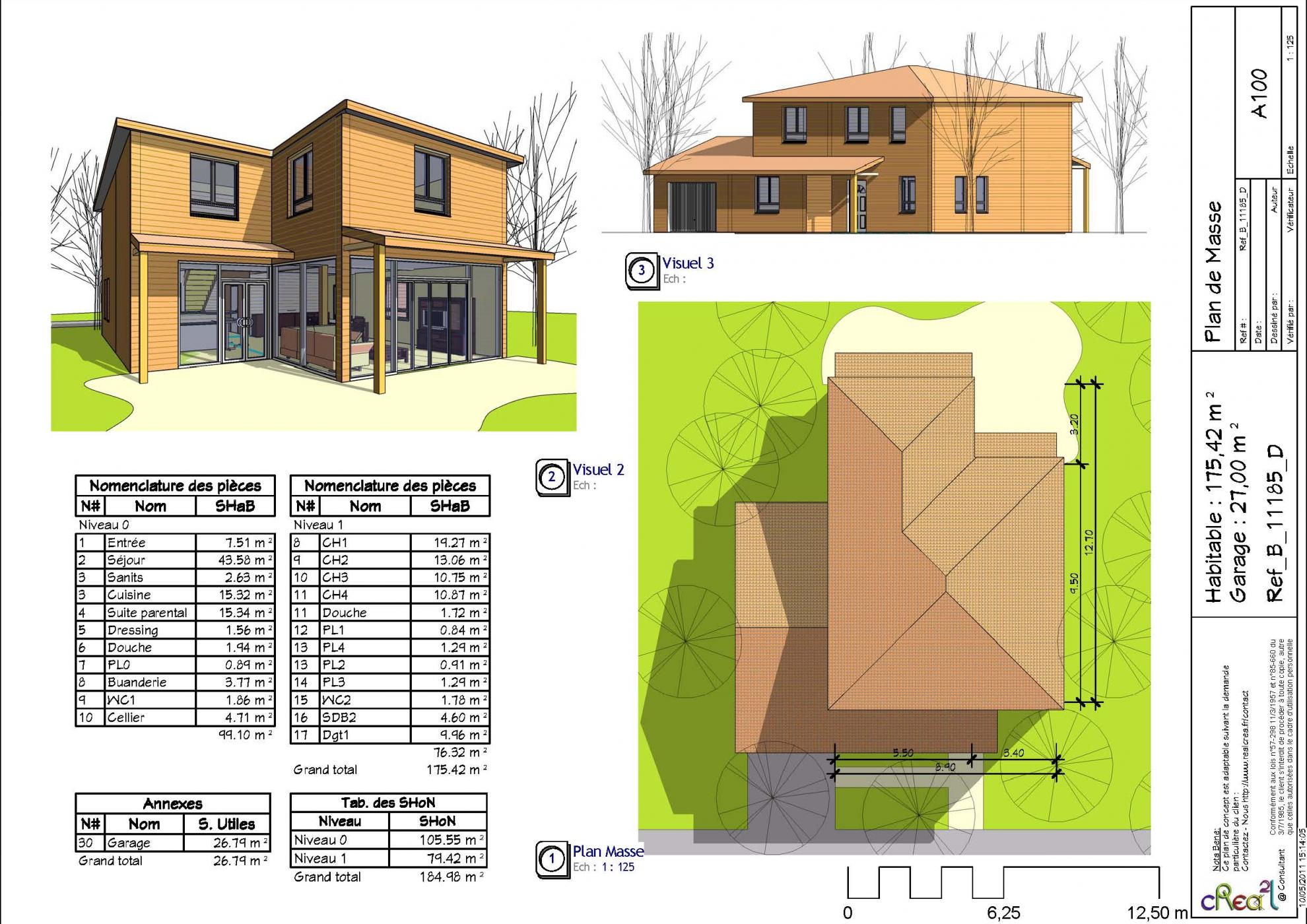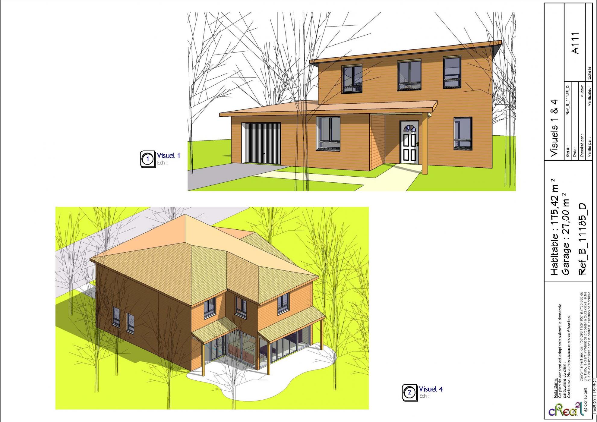 Plan B_11185_D : Maison en bois contemporaine, R+1, 5 chambres, 172 m² habitables, double garages.