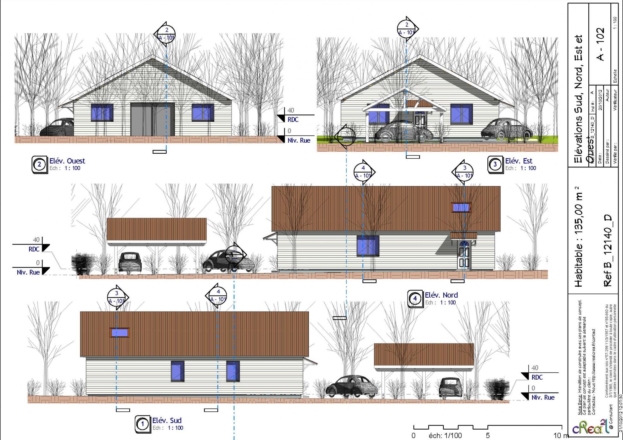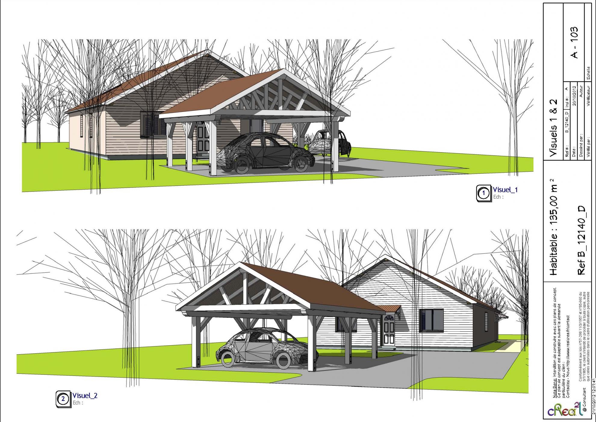 Plan B_12141_D : Maison en bois moderne, plain-pied, 3 chambres, 135 m² habitable avec grand carport 2 places.
