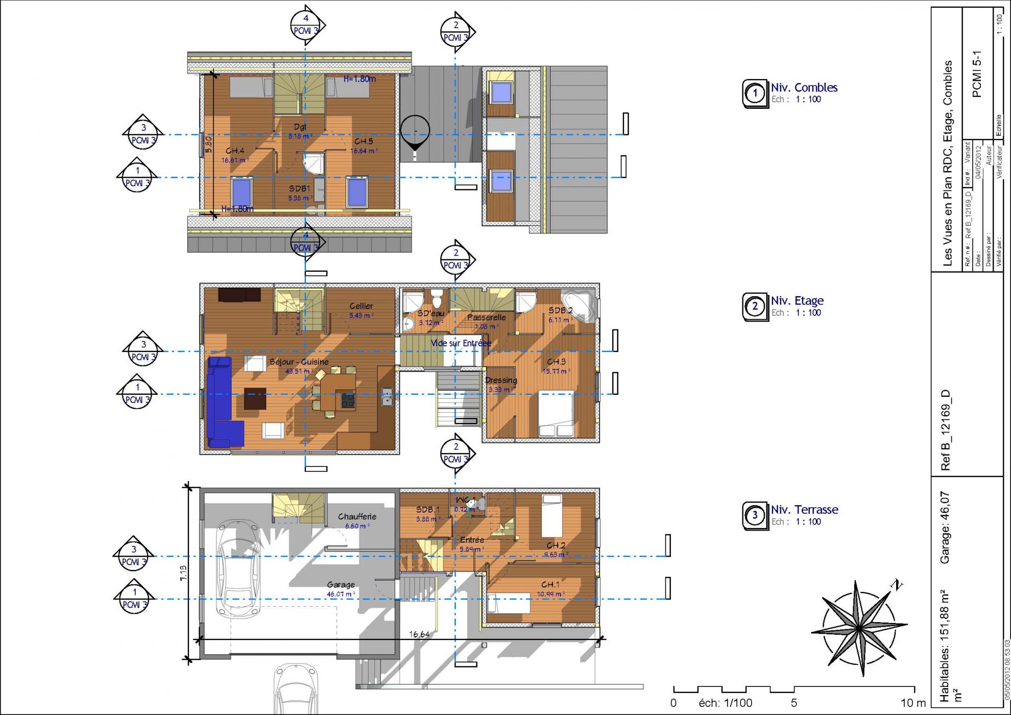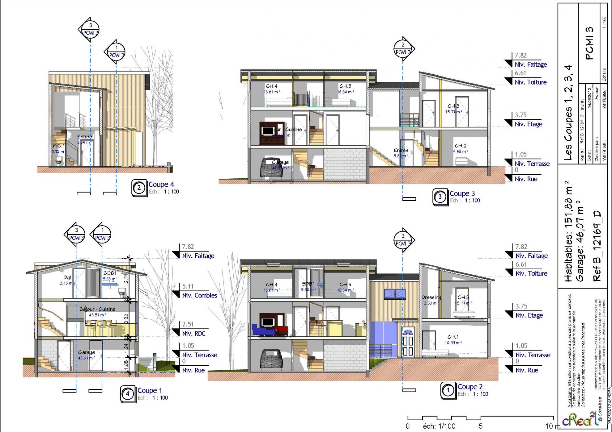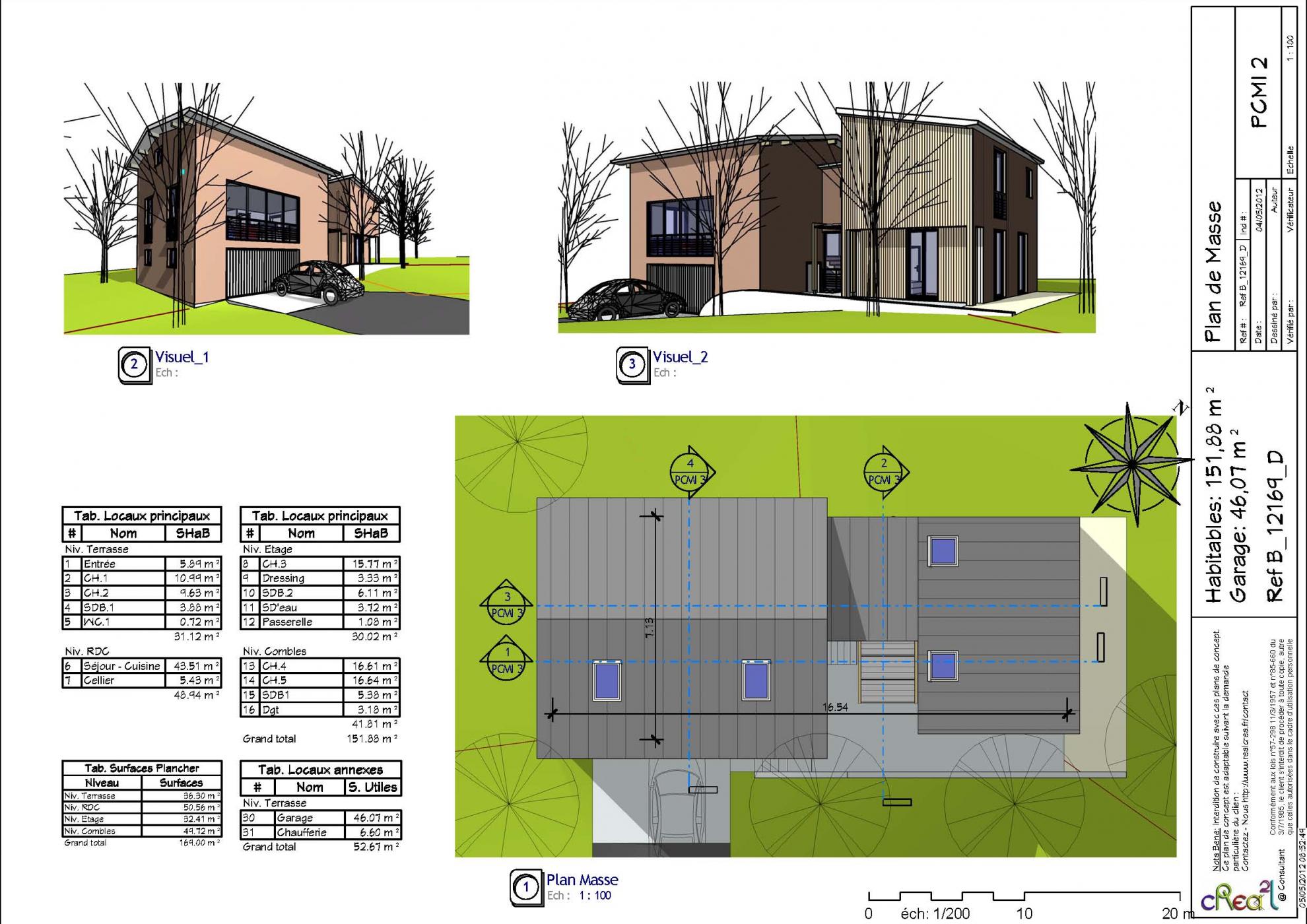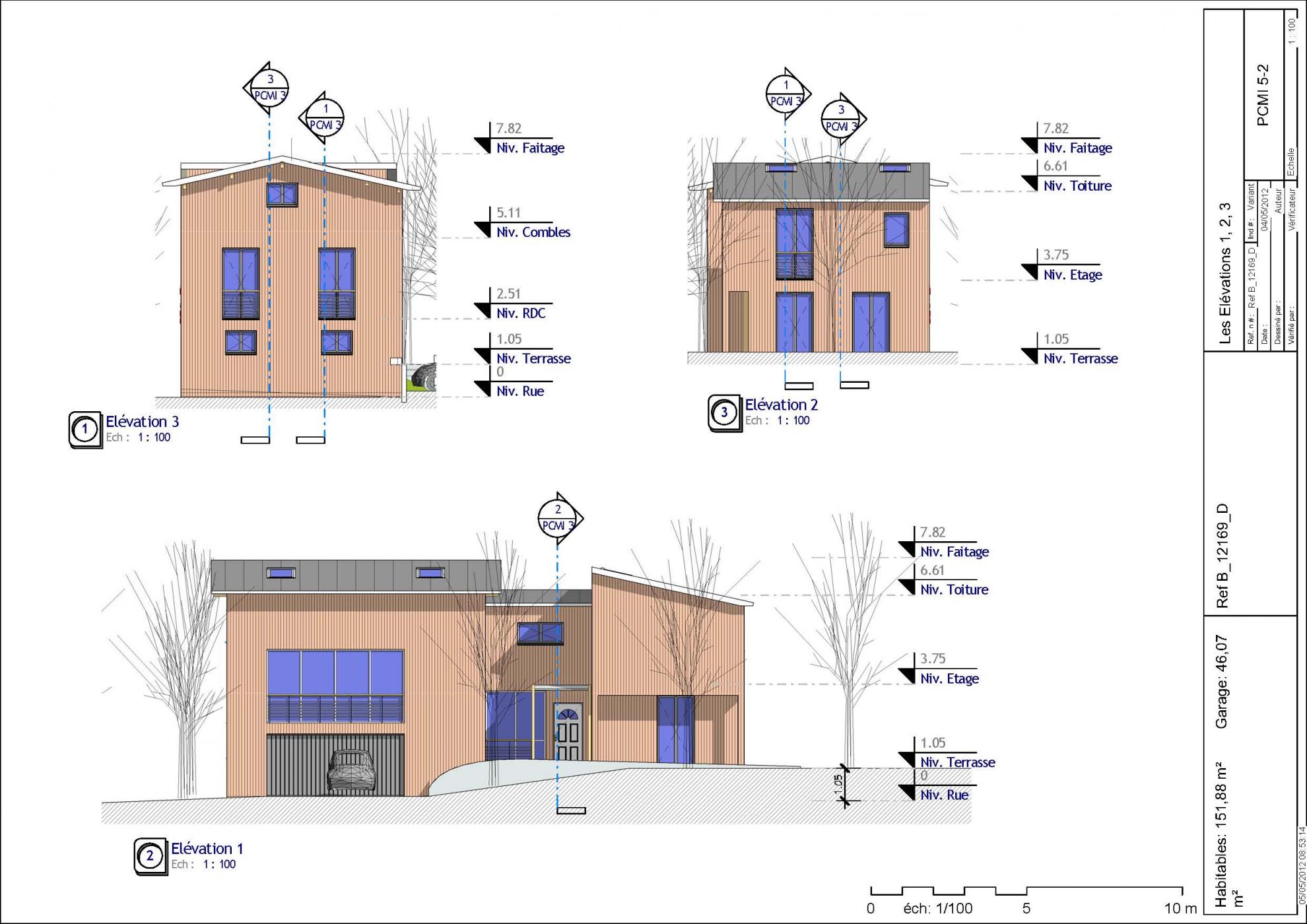 Plan B_12169_D : Maison bois moderne, R+2, 152 m², 1 suite parentale, 4 chambres, double garage en sous-sol.