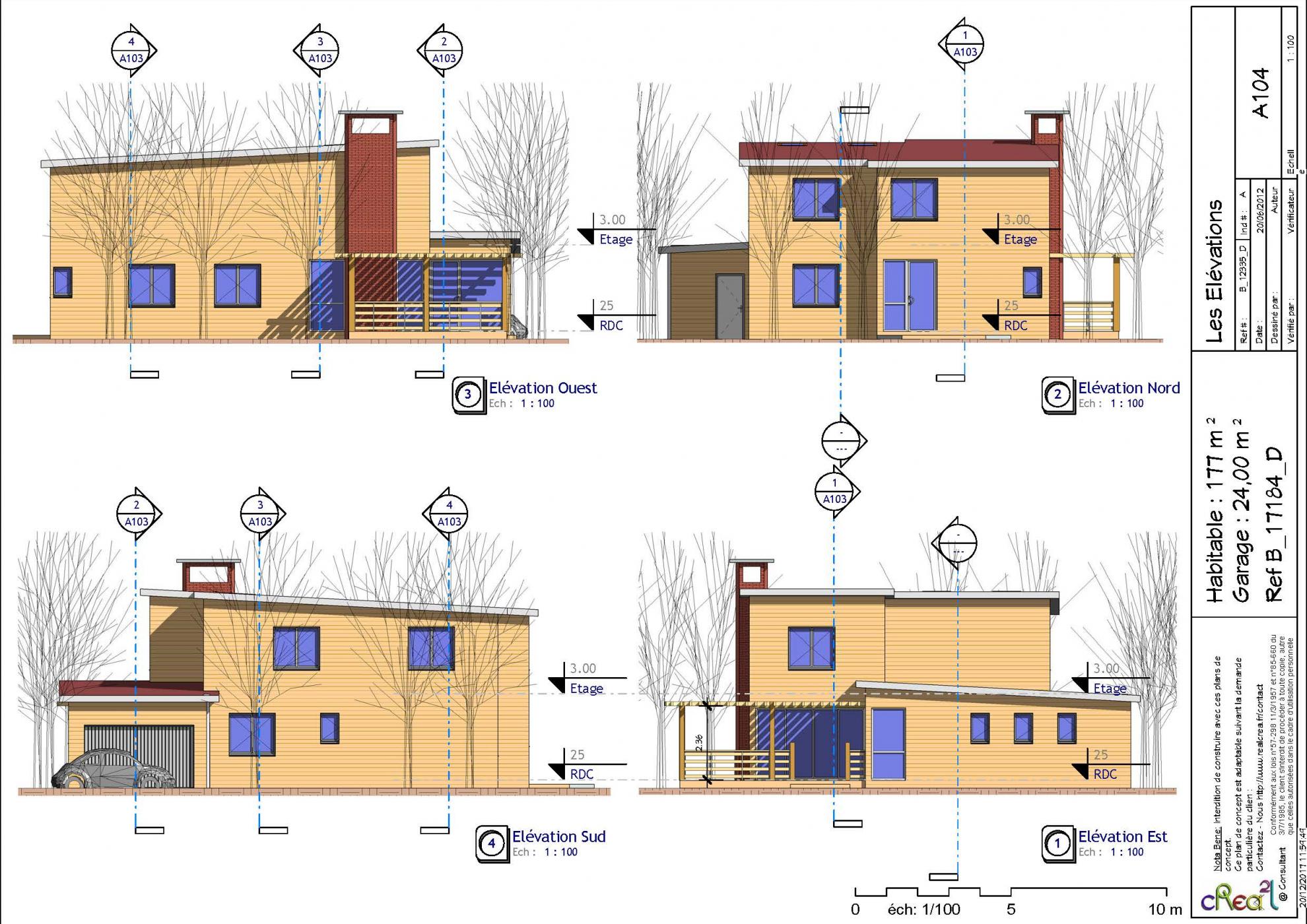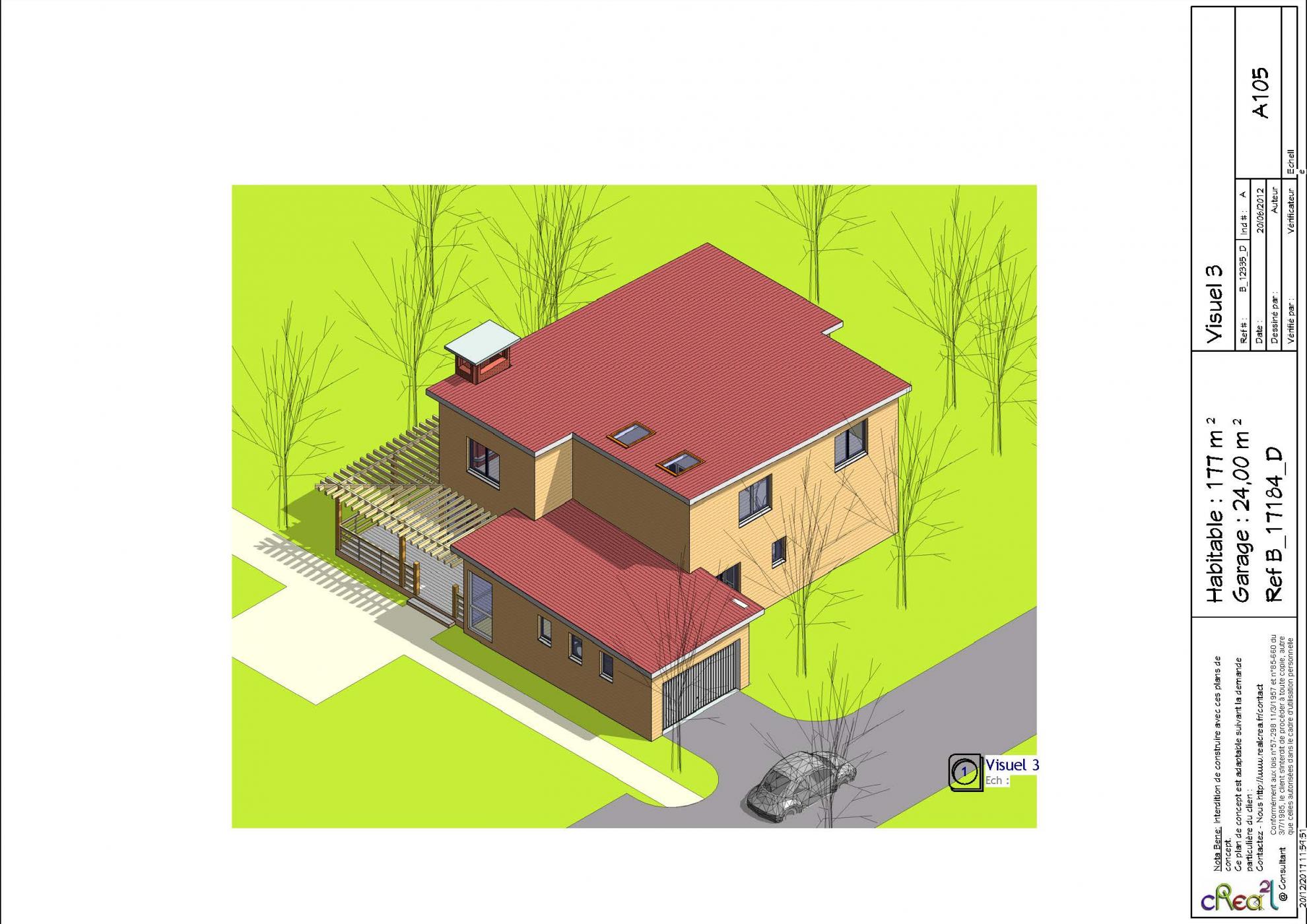 Plan B_17184_D : Maison en bois moderne, R+1, 1 suite, 2 chambres, 1 Bureau, 163 m² habitable, Grand Garage intégré