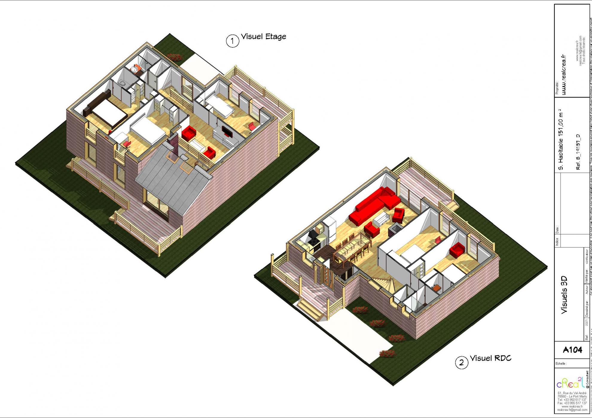 Plan B_19157_D : Maison en bois à des terrasses, grand espace de vie, 2 suites, 3 chambres, 151 m² habitables.