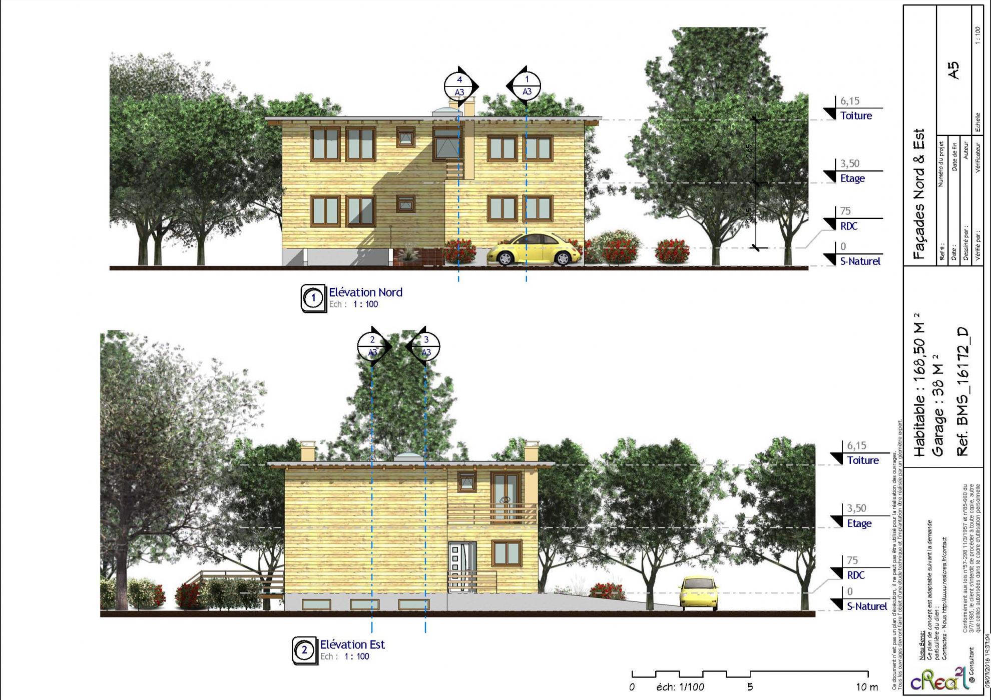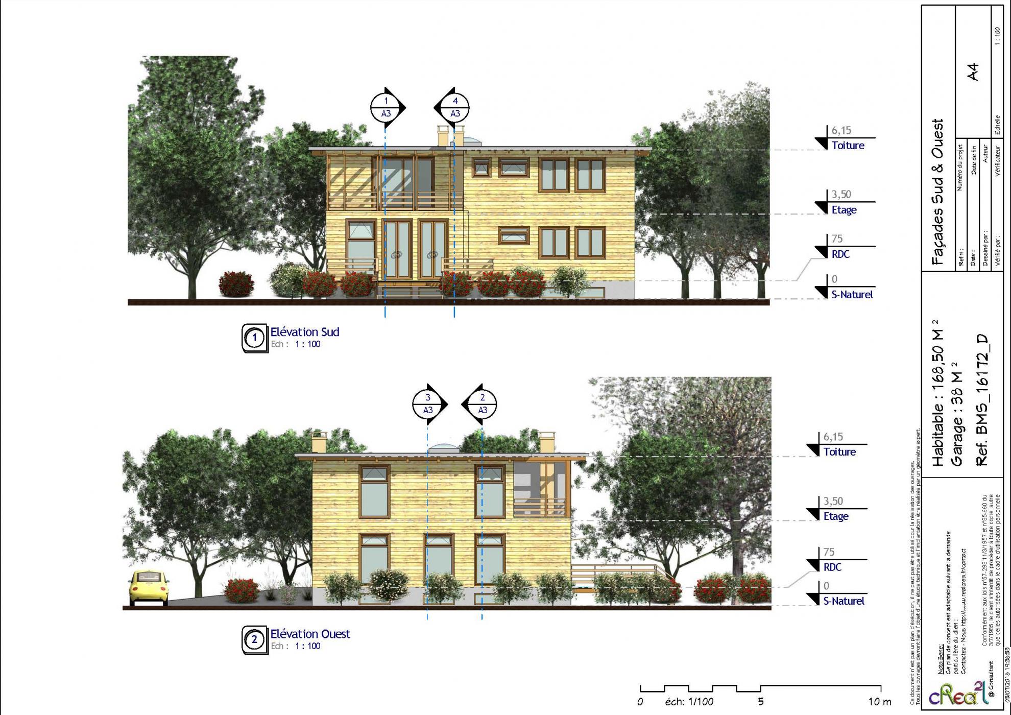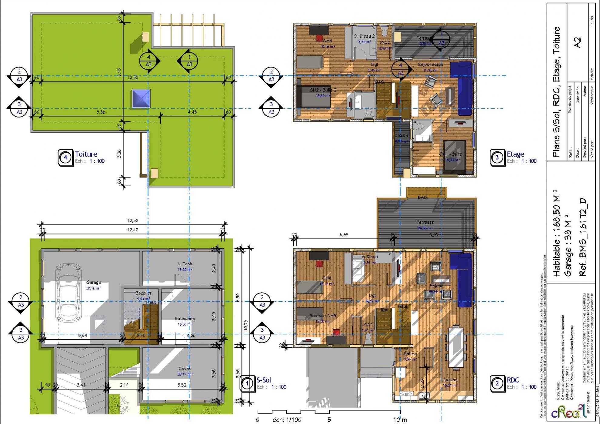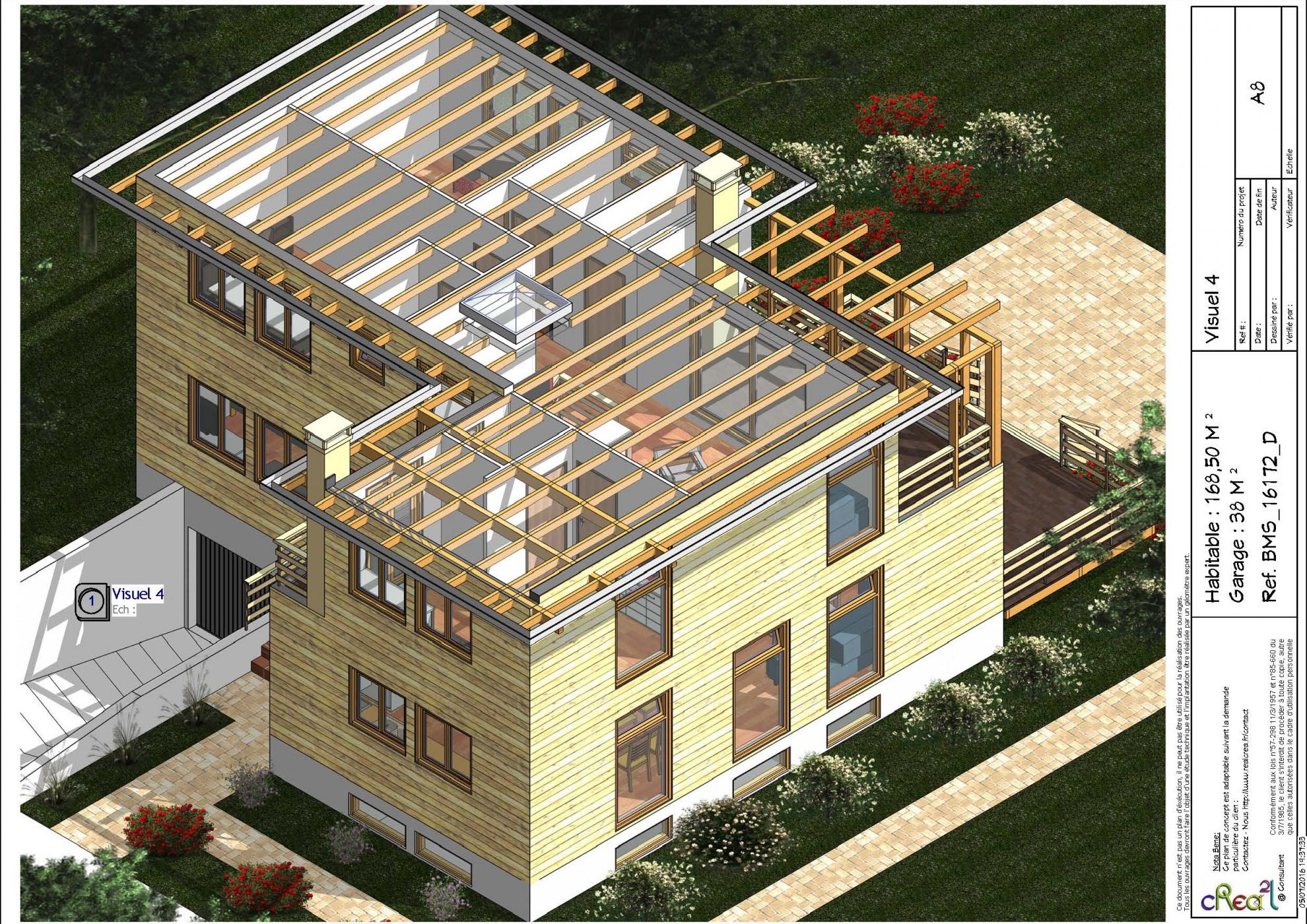 Plan BMS_16172_D : Maison en bois contemporaine, T5, 168 m², Grand séjour, Cuisine ouverte, 2 suite parentales, 3 chambres et grand garage en sous sol.