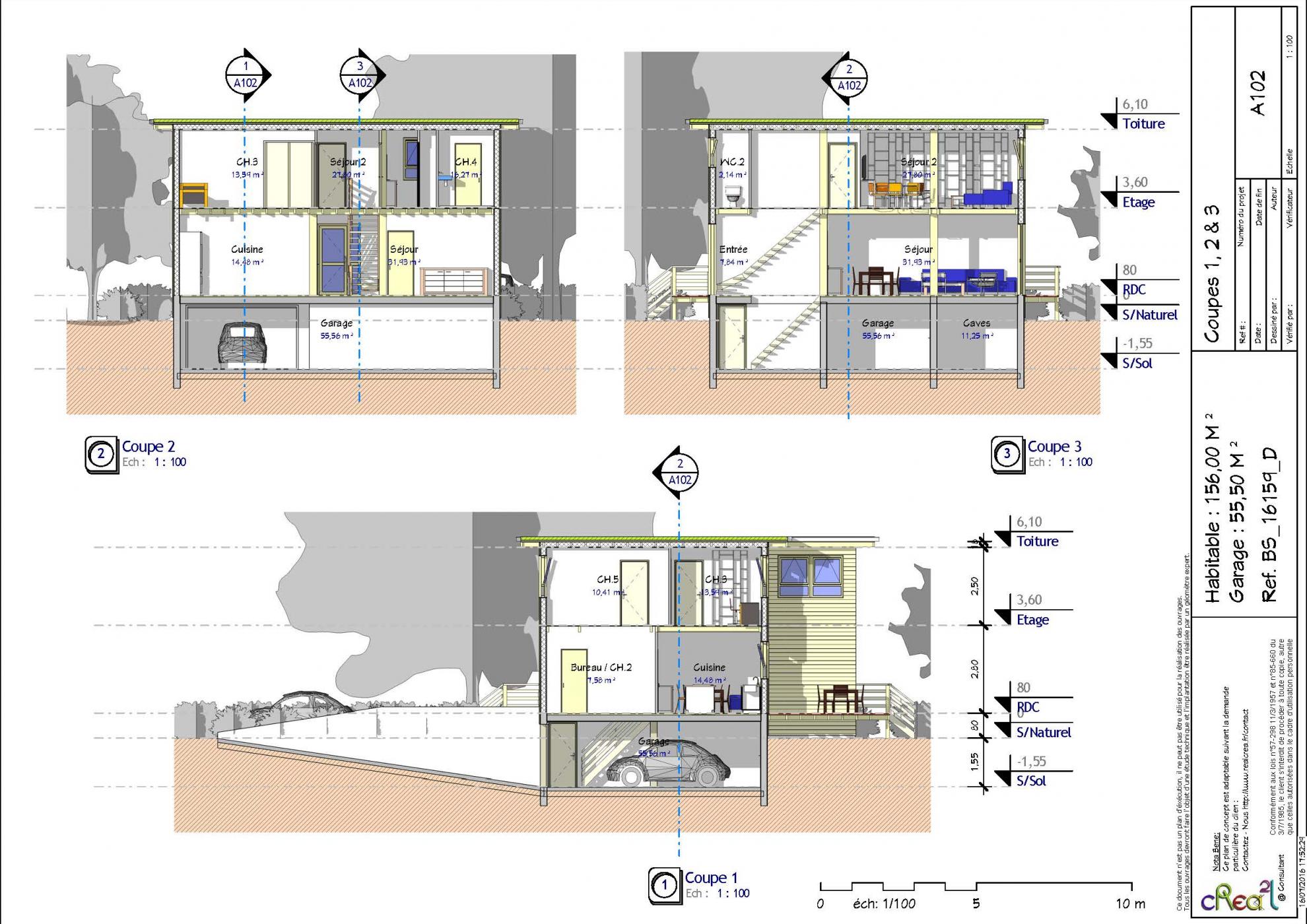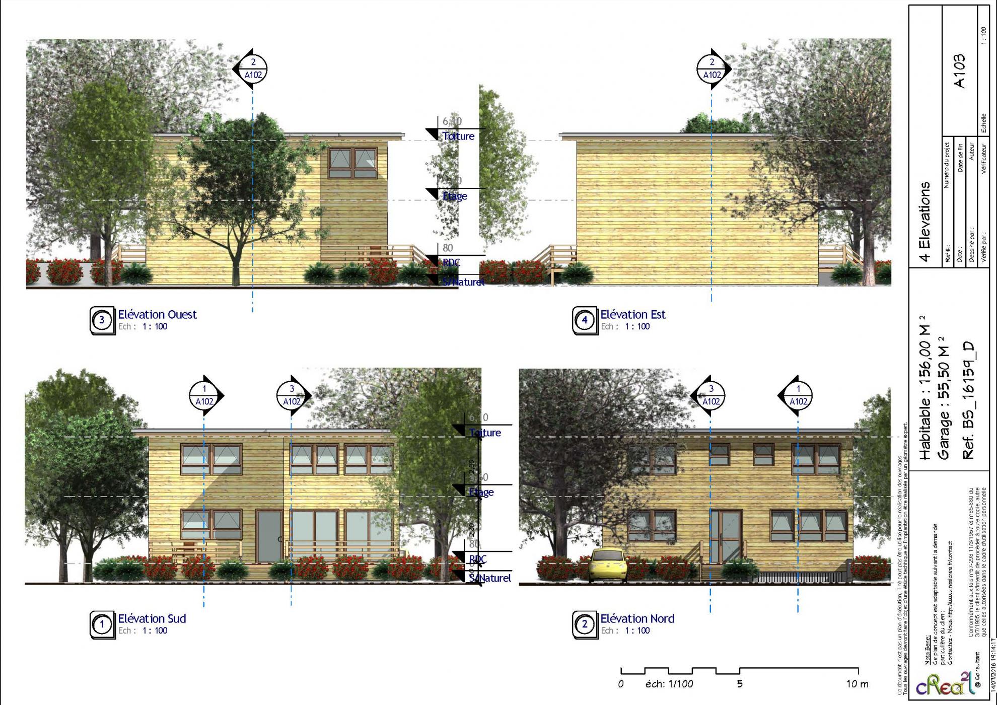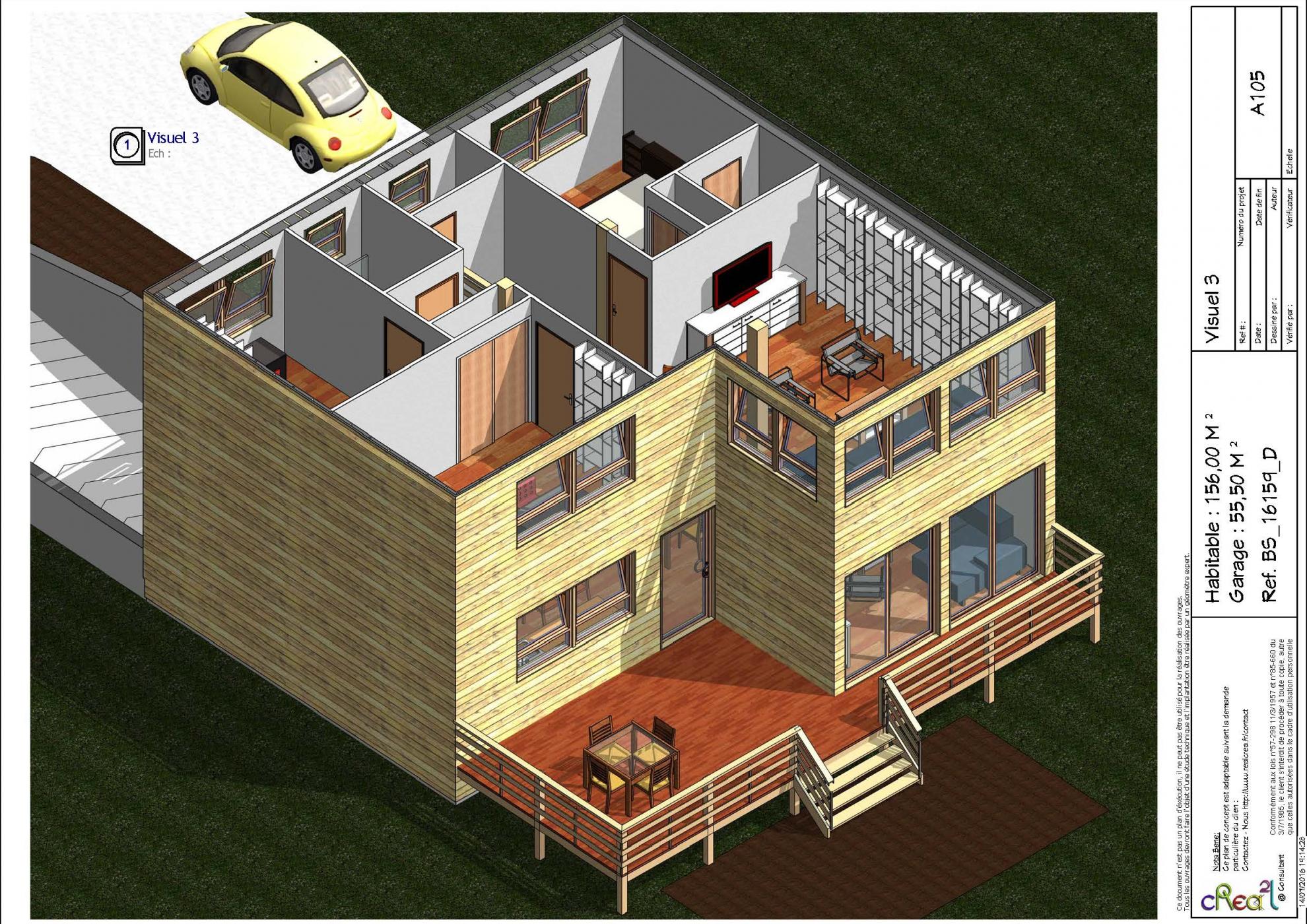 Plan BS_16159_D : Maison Bois contemporaine, T5, 156 m², 4 Chambres et 1 Suite, 2 séjours, Terrasse privative, sous sol complet, grand Garage.